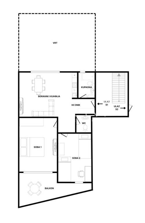 In a prestigious and peaceful location at the foot of Medvednica, a luxurious three-room apartment is for sale, located on the first floor of an urban villa with a total of three apartments. Surrounded by greenery and nature, the apartment offers a high level of privacy with quick and easy access to all important city amenities. The apartment has a total area of 84.41 m² and has been carefully designed to make everyday life functional and comfortable. It consists of a spacious living room connected to the kitchen, two comfortable bedrooms, a bathroom, a separate toilet, and a covered balcony overlooking the greenery. The private garden adds extra value, ideal for relaxation and outdoor stay. The apartment comes with a garage parking space and a storage room, which ensures additional comfort and practicality. The building is designed as a modern urban villa with an emphasis on the quality of construction, energy efficiency, and the long-term value of the property. High-quality materials were used in the construction and equipment, including PVC joinery in anthracite color with electric blinds and mosquito nets, underfloor heating in combination with heat pumps and air conditioners, and quality parquet and ceramics. Special attention was paid to earthquake-resistant construction and modern facade systems. The location allows quick access to public transport, schools, kindergartens, sports facilities, and the city center, while the Sljeme cable car, hiking trails, and numerous natural oases are located in the immediate vicinity. The apartment is oriented to the north and south, which ensures good lighting during the day. The completion of construction is planned for the summer of 2026, and the property has proper documentation, including a title deed and a building and usage permit. For additional information or to arrange a viewing, feel free to contact us.