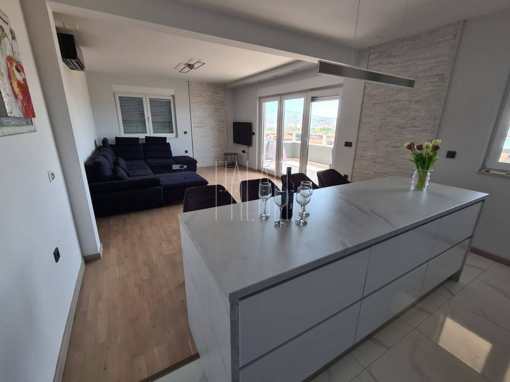 We mediate in the sale of a luxury penthouse with a panoramic view of the sea. It is located on the last floor of a smaller residential building. The building has a communal pool. The building has an A+ energy certificate. The penthouse has a total living area of 83.19mm² , and consists of a kitchen with a dining room and a large living room, three bedrooms, two bathrooms, an entrance hall, a storage room and a large loggia of 21.12m² . It has one outdoor parking space, which is included in the price of the apartment, and a 5m² storage room in the basement of the building. The penthouse is luxuriously decorated and is sold unfurnished but it possible to buy with furniture.