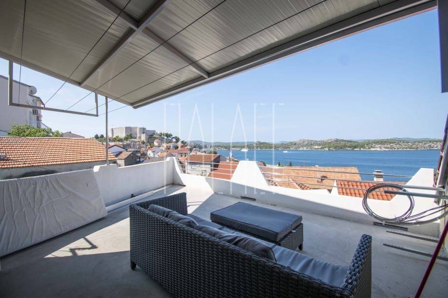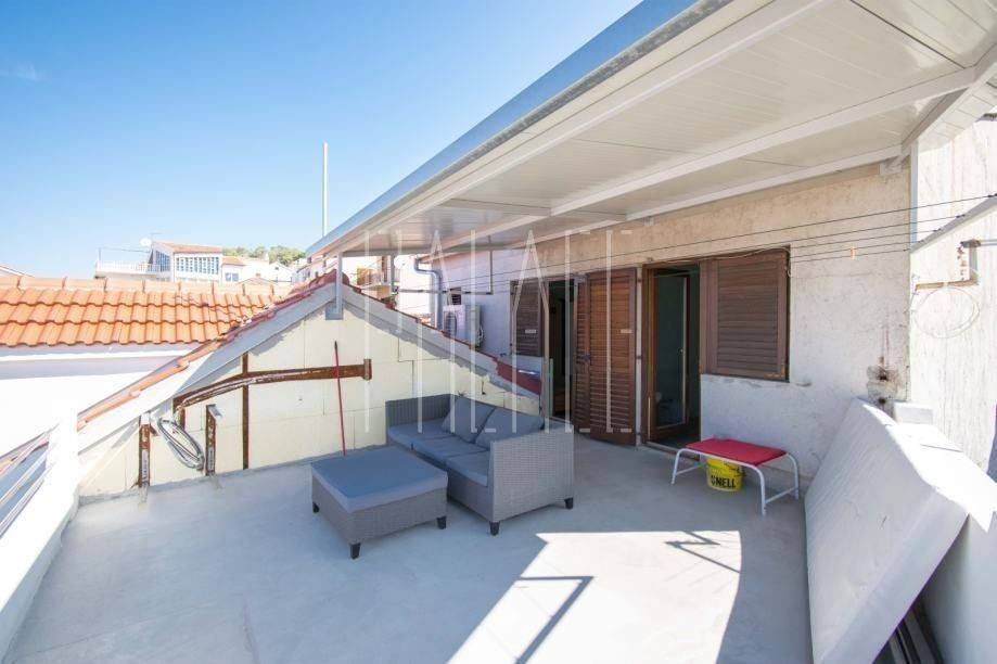 It consists of a kitchen with a dining room and a living room on the first floor. An internal staircase leads to the upper floor, where there are two bedrooms, a bathroom, and a spacious terrace with a view of the city and the sea.