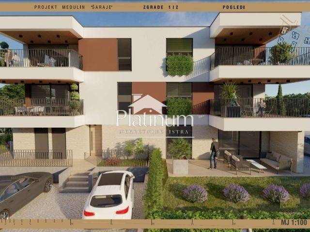 A new project is under construction in Medulin. The location is approximately 900 m from the sea. It is a project of 10 residential buildings each with three apartments. There will be a total of 30 apartments, distributed on the ground floor, first and second floor. The apartments are sold on a turnkey basis, with complete carpentry, equipped bathroom, security doors, and air conditioners. Start of construction: end of 2022 Planned completion of construction: end of 2023 The contractor is a company with many years of experience in the construction of residential buildings. The apartment consists of: Living room with dining room and kitchen - 28.88 m2 2 bedrooms bathroom Terrace - 13.35 m