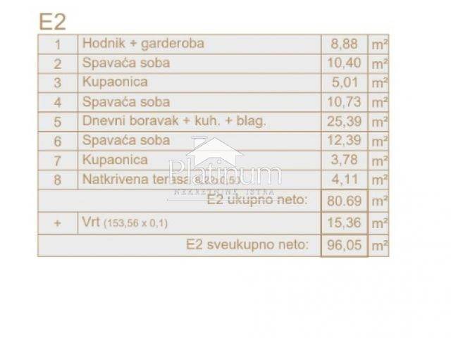 Istria, Liznjan we are selling an apartment on the ground floor with a total area of 96.05 m2 The apartment consists of: entrance hall, three bedrooms, living room, two bathrooms, kitchen, dining room and large terrace, garden 150 m2 The apartment includes a parking space at the price of 8,270.00 and a storage room at the price of 7,680.00. It is planned to move in by the end of 2023. The apartment is located in a quiet location near the sea, only 5 km from the famous tourist resort of Medulin. INFO AT 00385911608456