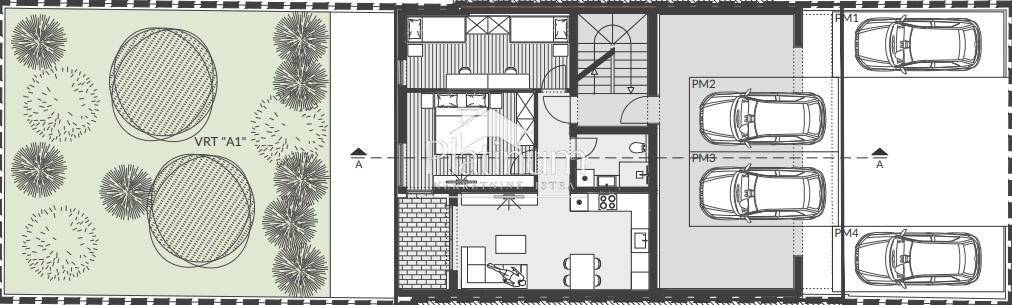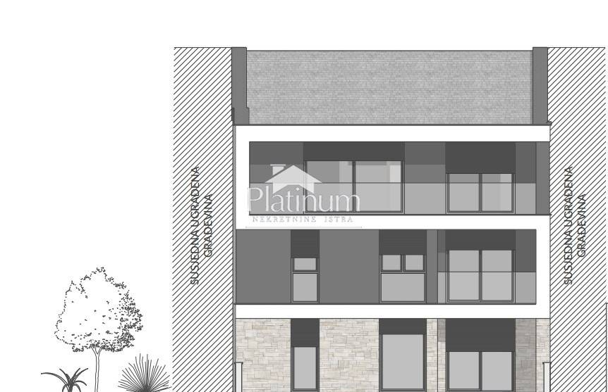 In Banjole, not far from the town center in a quiet street, this beautiful apartment under construction is for sale, consisting of a hallway, living room with kitchen and dining room, two bedrooms, bathroom, loggia, storage room, outdoor parking space and garden (126m2). Total area 80.23m2 (shown in the description). Heatin