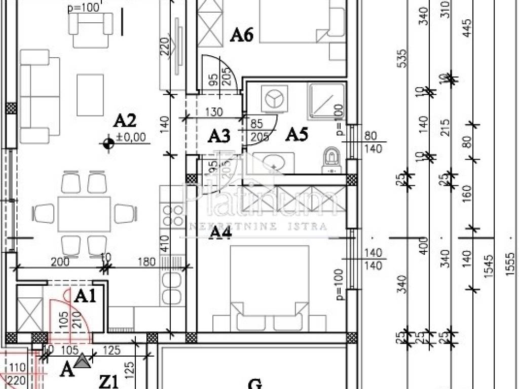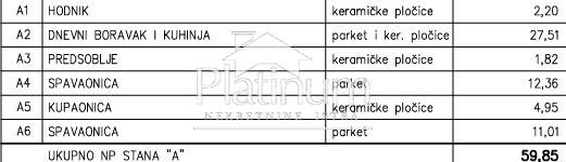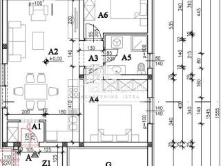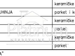 In a quiet part of Medulin, this ground floor apartment is for sale, consisting of a hallway, living room and kitchen, hallway, two bedrooms, bathroom. It is possible to purchase a garage or parking space and a storage room with the apartment. The garden belongs to the ground floor apartment. Heatin