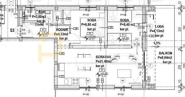 A spacious three-bedroom apartment located on the ground floor of a building situated in a pine forest is for sale. It consists of a living room with a kitchen and dining area (21.40 m²), a bathroom with a toilet (3.60 m²), a hallway (4.94 m²), two bedrooms (8.80 and 8.40 m²), a spacious balcony (4.13 m²), and a garden area of 90 m². The apartment also includes two parking spaces. The building has 9 residential units and is located in a peaceful location, just 2 minutes from the main beach Veliki Dubrovnik.