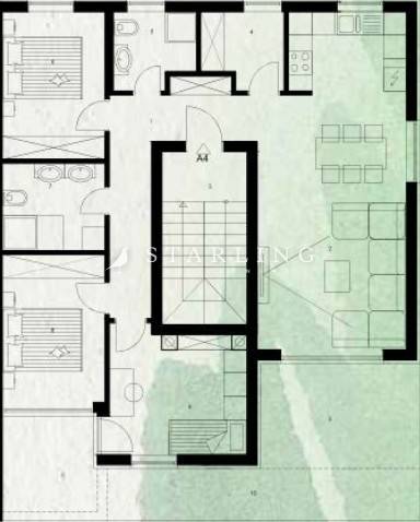A penthouse with a total area of 120 m2 is for sale, located in a peaceful area with a beautiful view of nature. The apartment is situated on the first floor of a residential building, which has a total of four apartments.