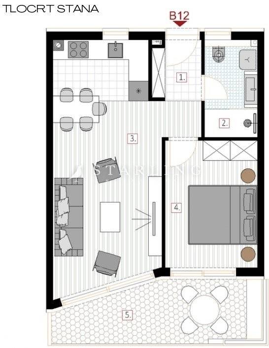 APARTMENT, SALE, NEW BUILDING, PULA, 50.22 m2 Luxury apartment with a total living area of 50.22 m2, in a fantastic location, first row to the sea, with a beautiful view of the sea. The apartment is located on the first floor of an urban residential building that has a total of thirty-six apartments. The apartment consists of an entrance hall with a wardrobe, a bathroom. living room with kitchen and dining area, bedroom, and loggia. The apartment is sold on a 'turnkey' basis, with a fully equipped bathroom (with associated furniture and sanitary ware), with floor coverings in all rooms together with white walls and ceilings, with all electrical installations and installed air conditioners, and installed all internal and external carpentry. The assembled entrance door will be anti-burglary and fire-proof. Also, the apartment will have an antenna system as well as a UTP network. Apart from the bathroom, the apartment is sold unfurnished. Parking space is paid additionally. All parking spaces are located in the underground levels of the building. Also, with the apartment, it is possible to buy a storage room with an additional charge. The storage rooms are located on the same levels as the parking spaces. Completion of the construction is planned for the middle of 2024. Heating/Cooling: air conditioning in all rooms. Orientation: west. Distance from the sea: 50 m. Ownership: 1/1, unencumbered. Price: 282,500 euros.