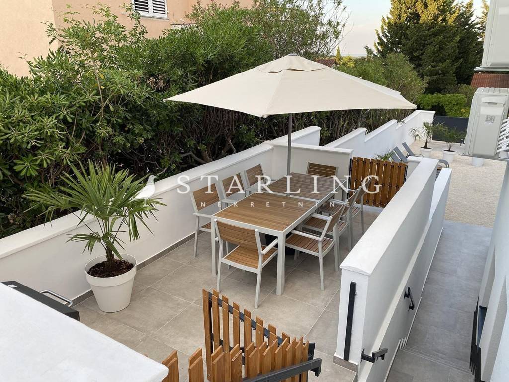 It is equipped with underfloor heating (heat pump), air conditioning. On the ground floor of the apartment there is a part of the garden that is very nicely decorated.