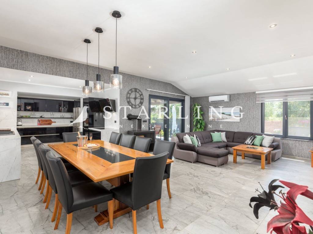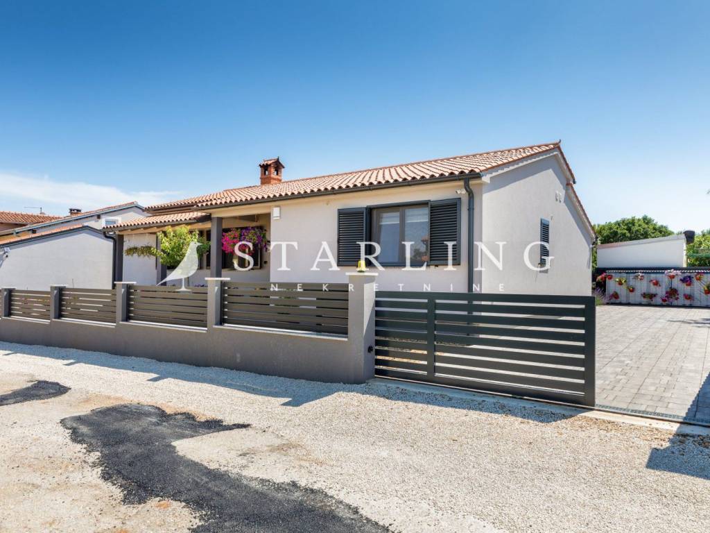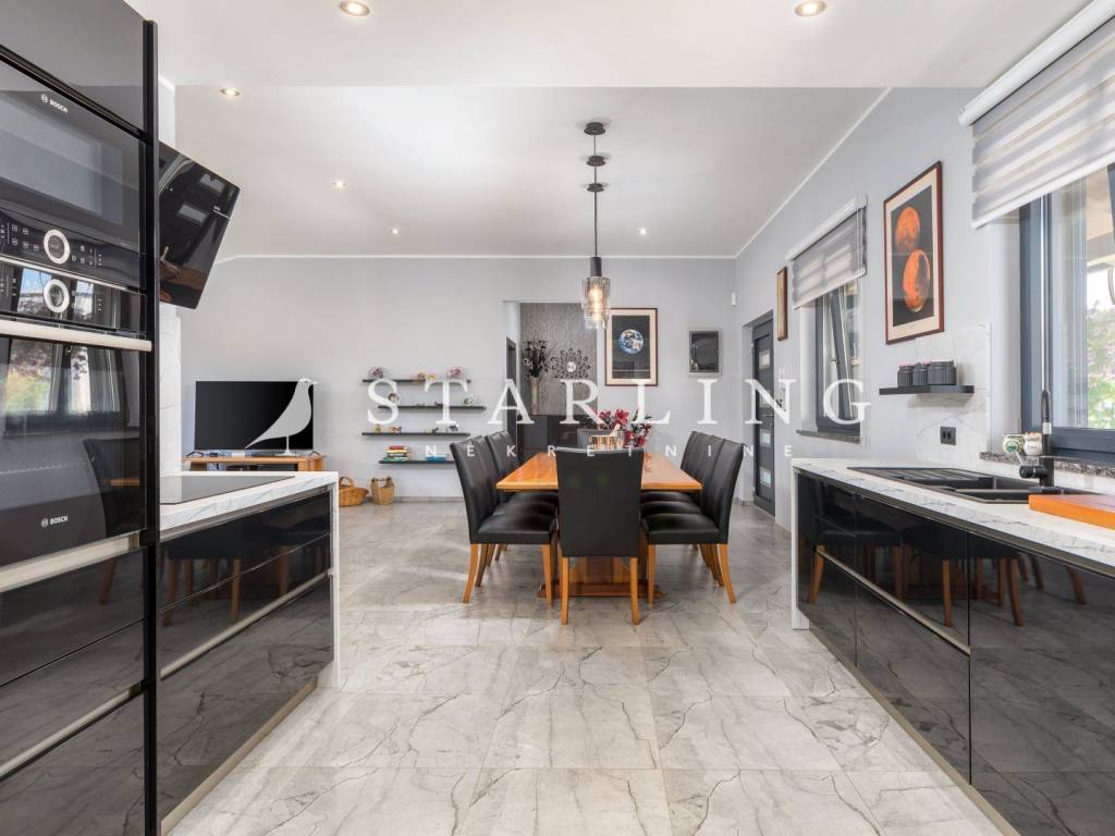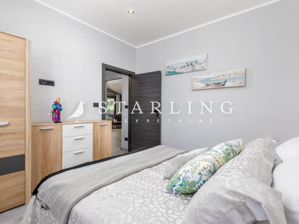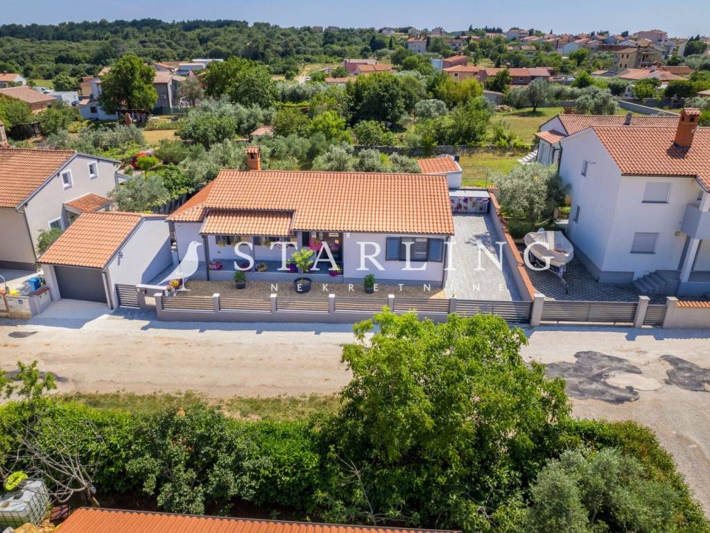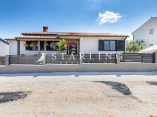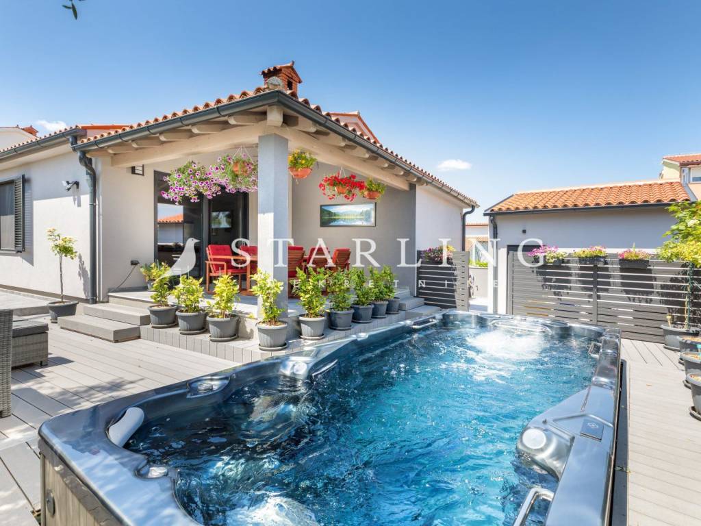 A luxurious single-story villa is for sale in Štinjan, with a surface area of 140 m², ideal for those seeking peace and privacy. It is located in a prime location, just 800 meters from the sea and the popular Hidrobaza beach. The villa consists of two spacious bedrooms, each with its own bathroom, one of which is en suite with electric underfloor heating.