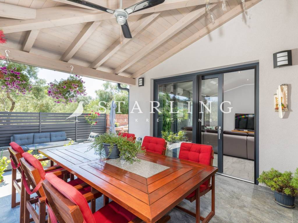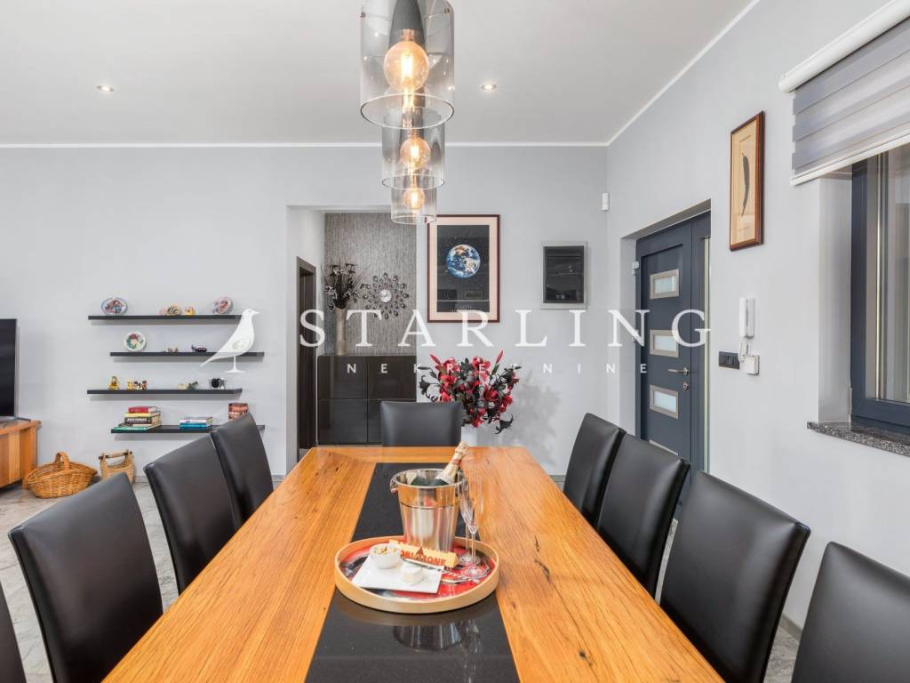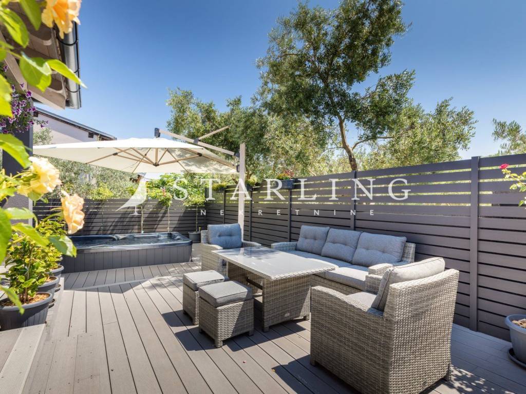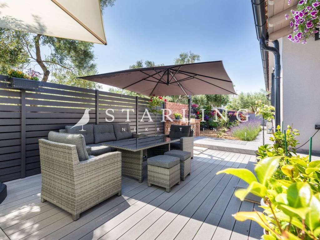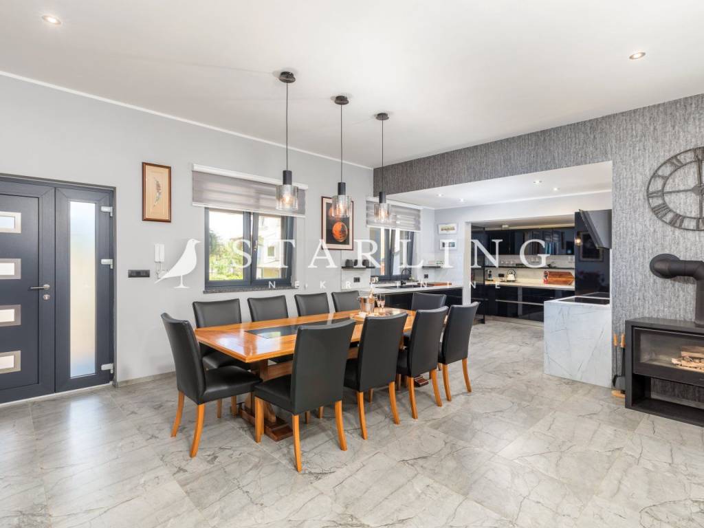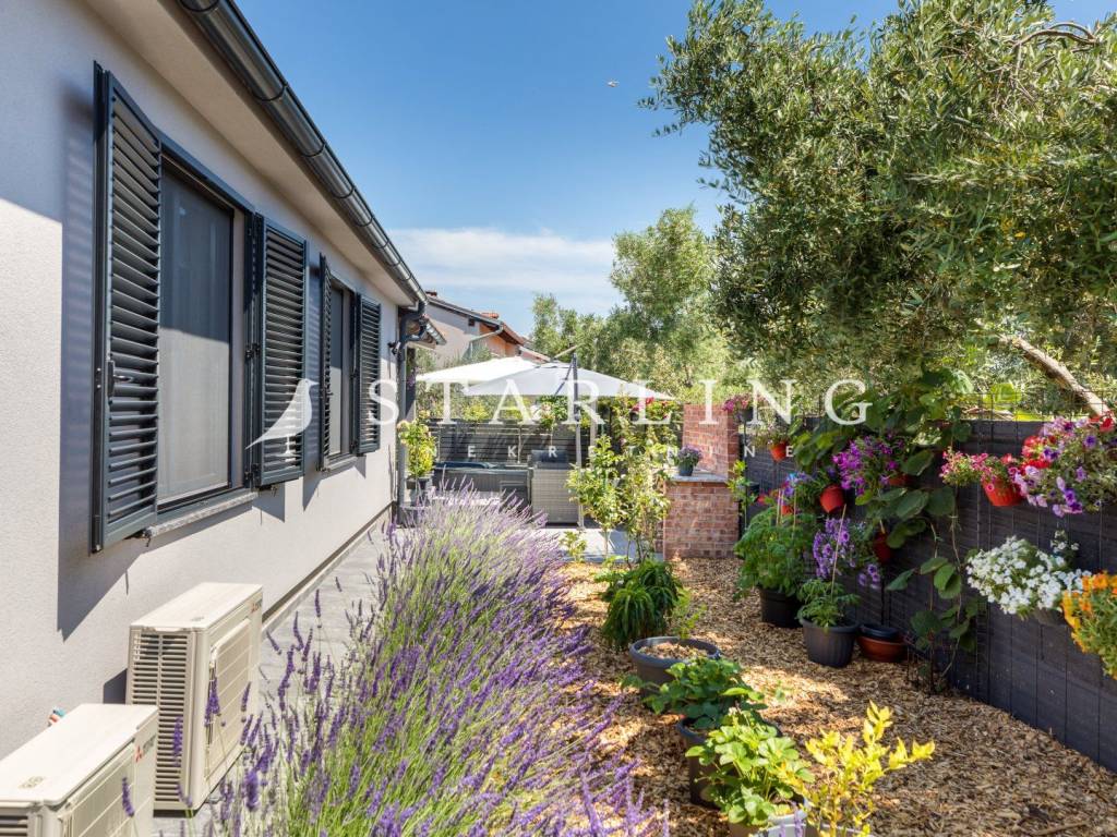 The exterior of this property offers complete privacy, as the yard is fully fenced and hidden from view. The plot on which the villa is situated covers 469 m², making it low-maintenance. The yard includes parking for three cars with automatic sliding gates, as well as a luxurious outdoor jacuzzi – whirlpool, perfect for relaxation. Additional space is provided by a covered terrace with a summer kitchen and barbecue, ideal for outdoor gatherings and meals on warm summer evenings.