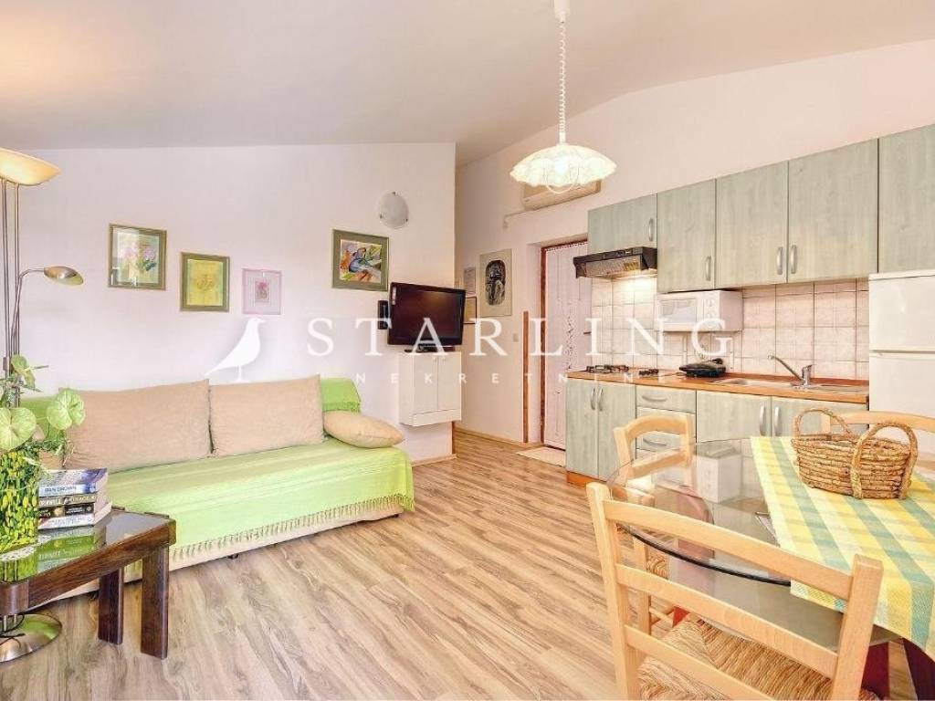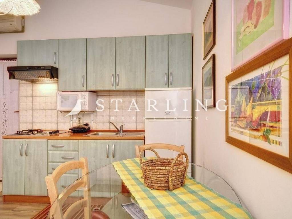 On the ground floor, one apartment features a bedroom, bathroom, and an open-plan living area with kitchen and dining space. It has a private entrance from the front of the house and direct access to the terrace and pool.