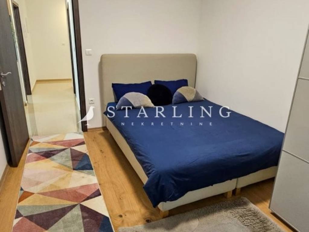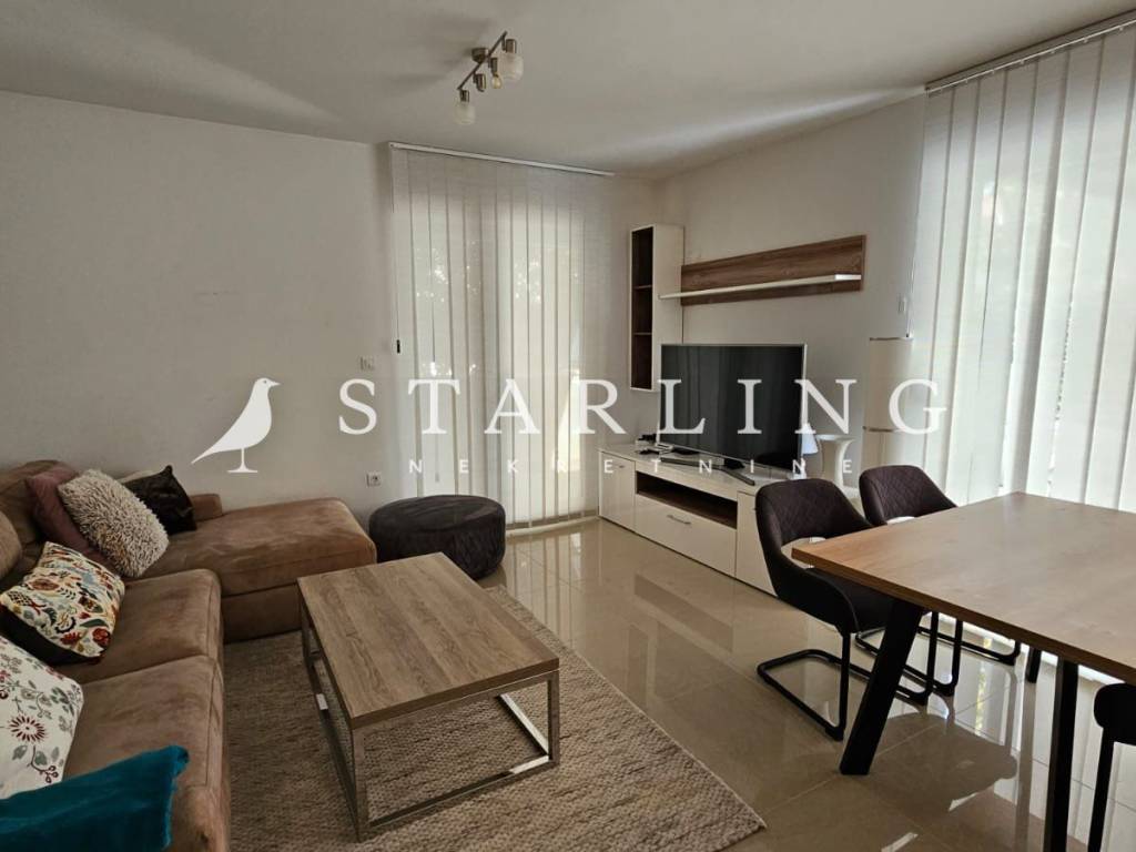 The apartment features two comfortable bedrooms and a modern bathroom with a walk-in shower, while an additional storage room ensures everyday practicality. A garage parking space is also included, further emphasizing the sense of security and comfort.