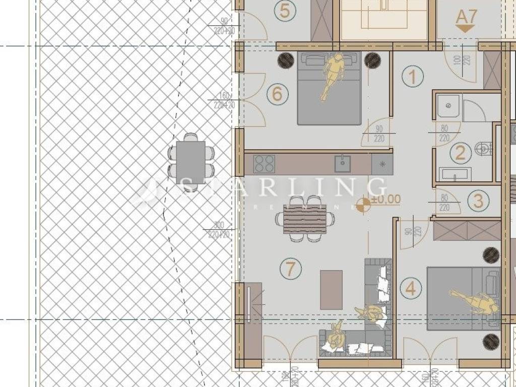 Upon entering, you are welcomed by a spacious hallway and a practical storage room, leading into a large open-space living area with a kitchen and dining room. From the living room, there is access to a breathtaking terrace of 83 m², of which 30 m² are covered, while the rest offers the perfect space for sunbathing and enjoying the view of nature.