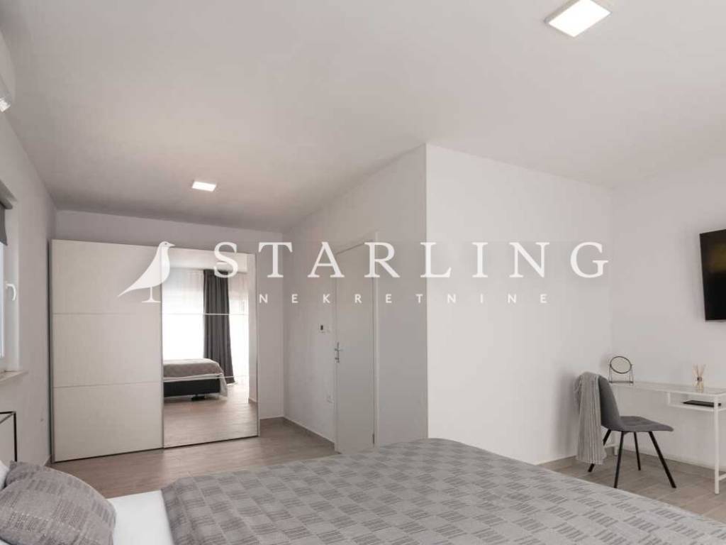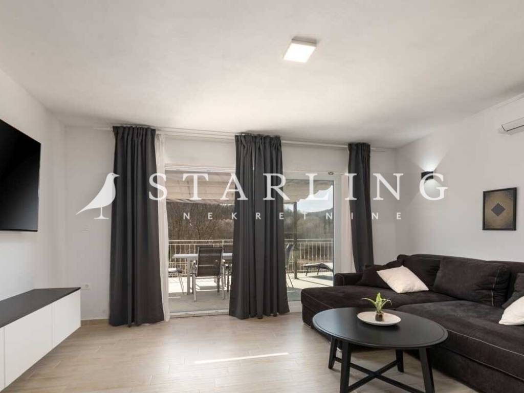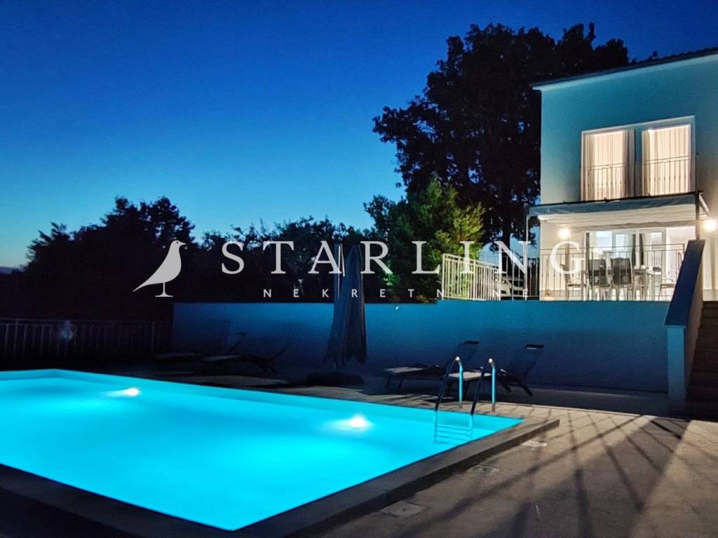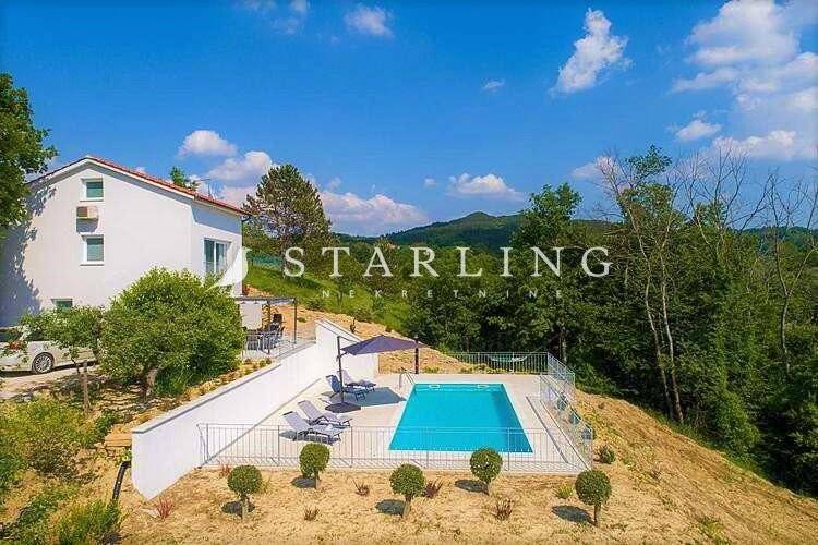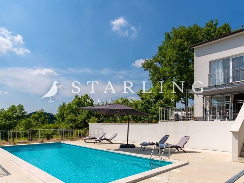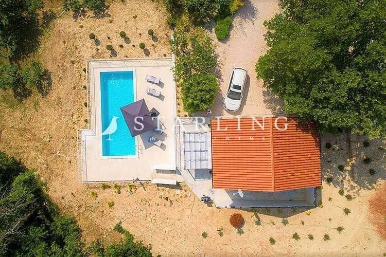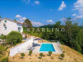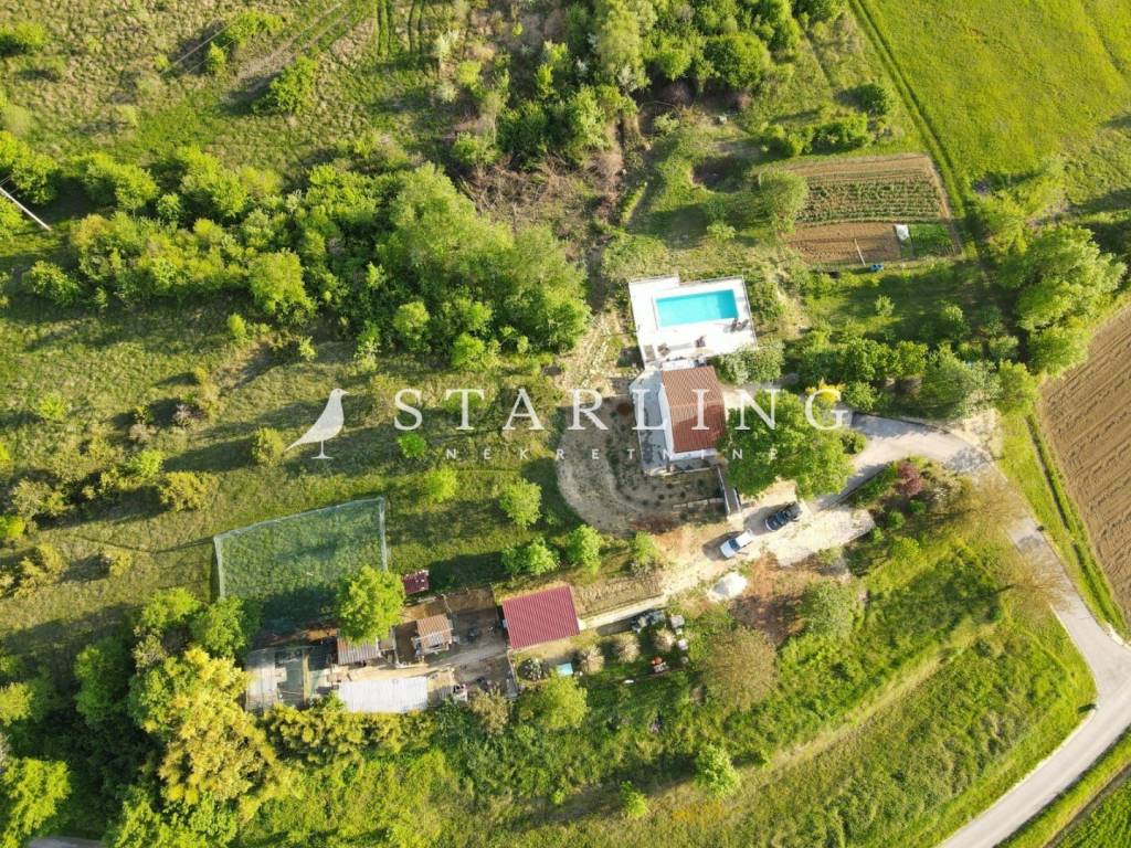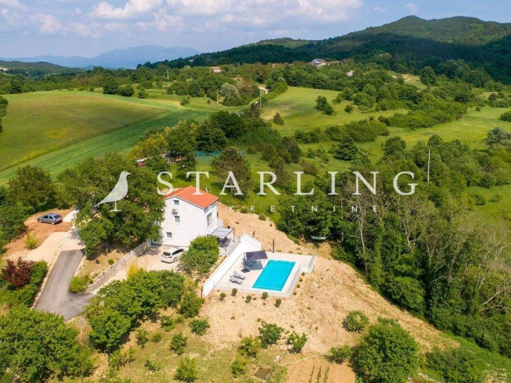 VILLA WITH SWIMMING POOL, SALE, PAZIN, 100 m2 A unique modern detached villa with a swimming pool, on a large property with a total area of 3848 m2, is located in a quiet location only 10 minutes' drive from the center of Pazin. The large garden provides complete privacy, while the private access road offers the possibility of installing an entrance gate for maximum isolation from the main road. The villa is equipped with concrete underfloor heating with smart technology for connecting to the Wi-Fi network and enables remote control of the heating in the house, which, in addition to superior thermal and hydro insulation, enables high energy efficiency. Also, there are air conditioners in all rooms. Although the property is completely isolated, there is a motorway interchange just a 3-minute drive away that connects this private oasis with the rest of Istria. The villa consists of: - GROUND FLOOR: large swimming pool measuring 10x4 m with a spacious terrace of 270 m2, a covered part of the terrace measuring 15 m2 with a dining table and barbecue, spacious parking for several vehicles, a garden house, landscaped grass area - GROUND FLOOR: modernly equipped living room with kitchen and dining room, exit to the terrace through a large glass wall. - FIRST FLOOR: bedroom with private bathroom, large glass wall with a wonderful view. - ATTIC: additional bedroom. Parking: spacious parking in the yard for several vehicles. Orientation: South Heating/cooling: electric floor (concrete floor) heating, air conditioning in all rooms. Ownership: 1/1. Price: 518,750 euros.