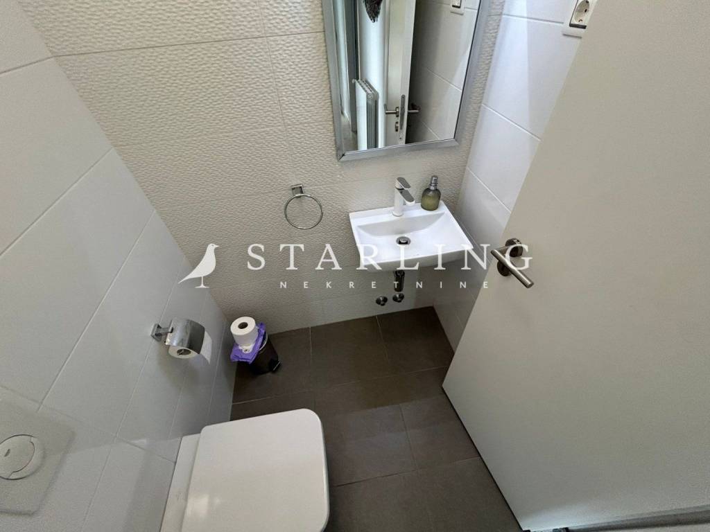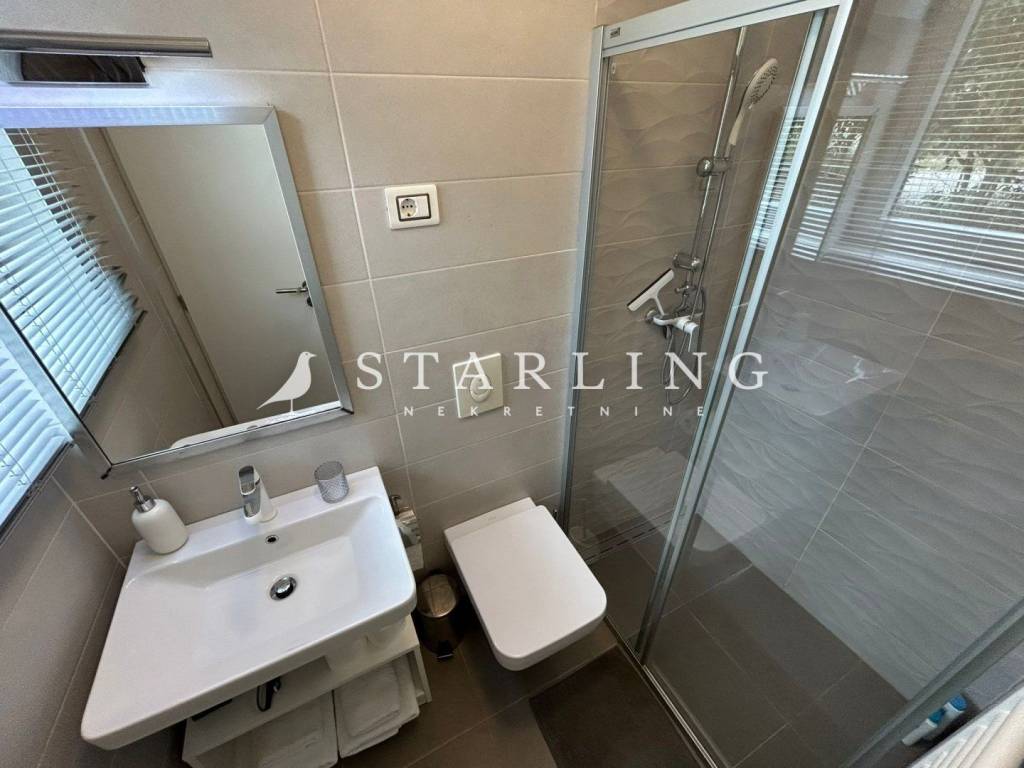 The house consists of an open-space living room connected with the kitchen and dining area, two bedrooms each with its own bathroom, a guest toilet, a balcony, a storage room, and a covered terrace. From the living room, there is access to a covered terrace with a seating area, next to which is a 24 m² swimming pool with a sunbathing area. The yard offers views of the natural surroundings.