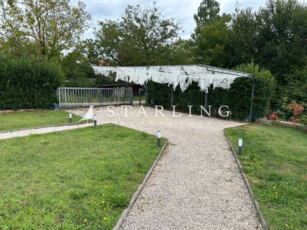 The garden is fenced and landscaped, with a lawn equipped with an irrigation system. Access is through electric entrance gates leading to parking for 3 cars.
