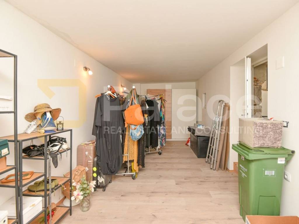 The apartment consists of an open concept living/sleeping area with a kitchen and bathroom with a total area of 19.13 m2. In front of the apartment, there is a partially covered terrace with a garden measuring 21 m2 and a small storage room. Behind the house, there is a large storage room of about 30 m2 currently used as a laundry room and wardrobe, equipped with all connections and easily convertible into residential space.