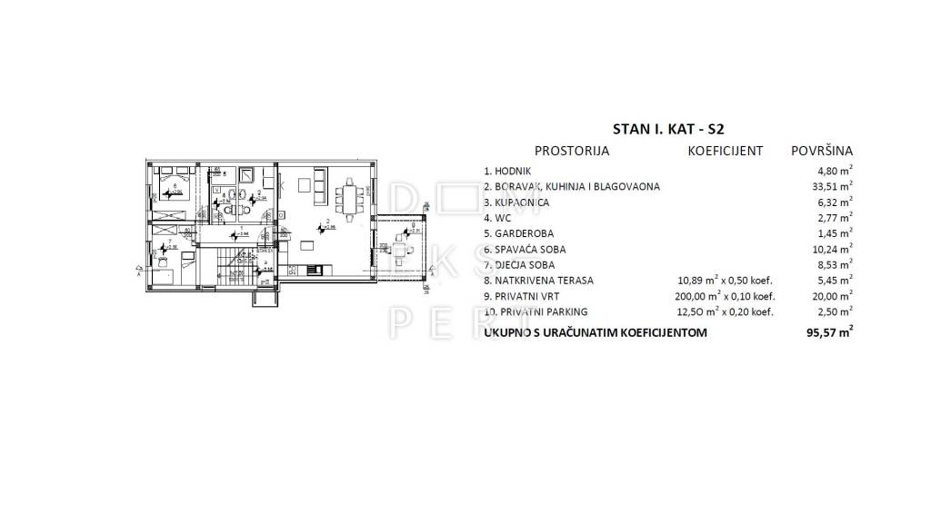 A 2-bedroom apartment with a private garden is for sale on the first floor of a smaller residential building in Sesvete (Zagreb), with a total saleable area of 95.57 m².