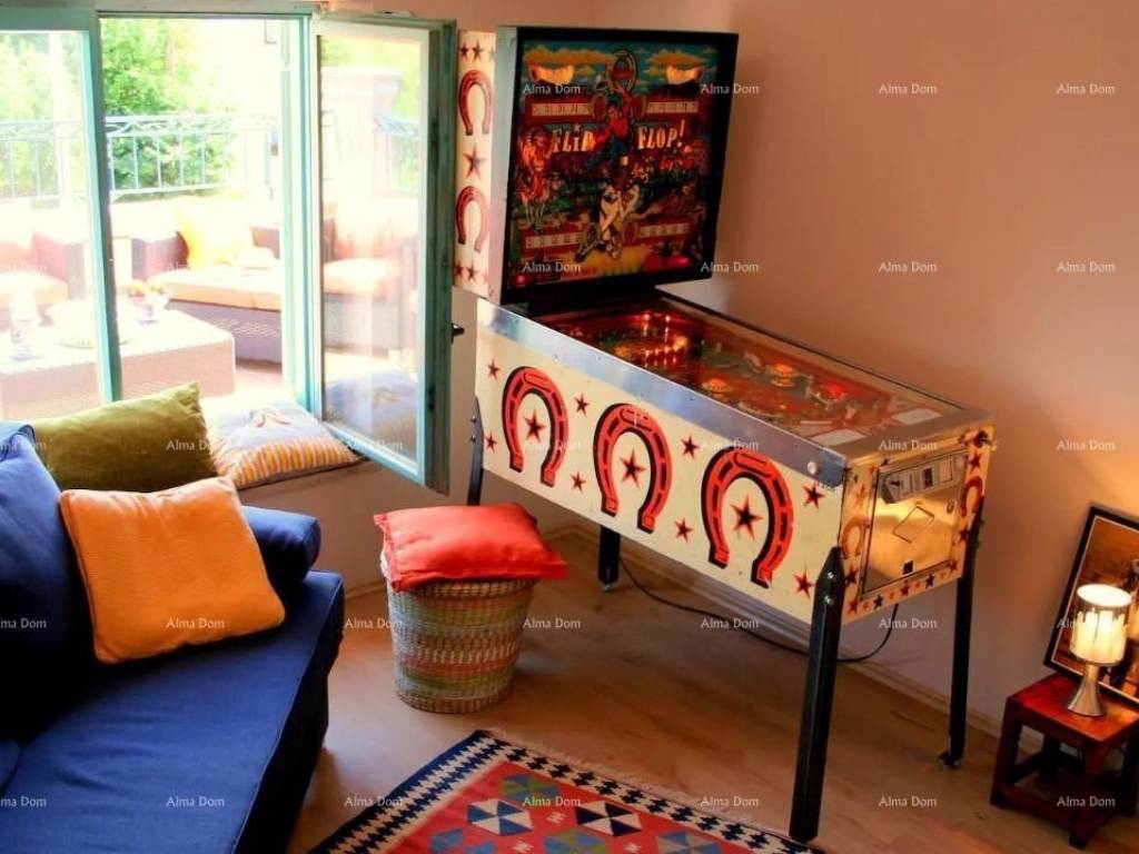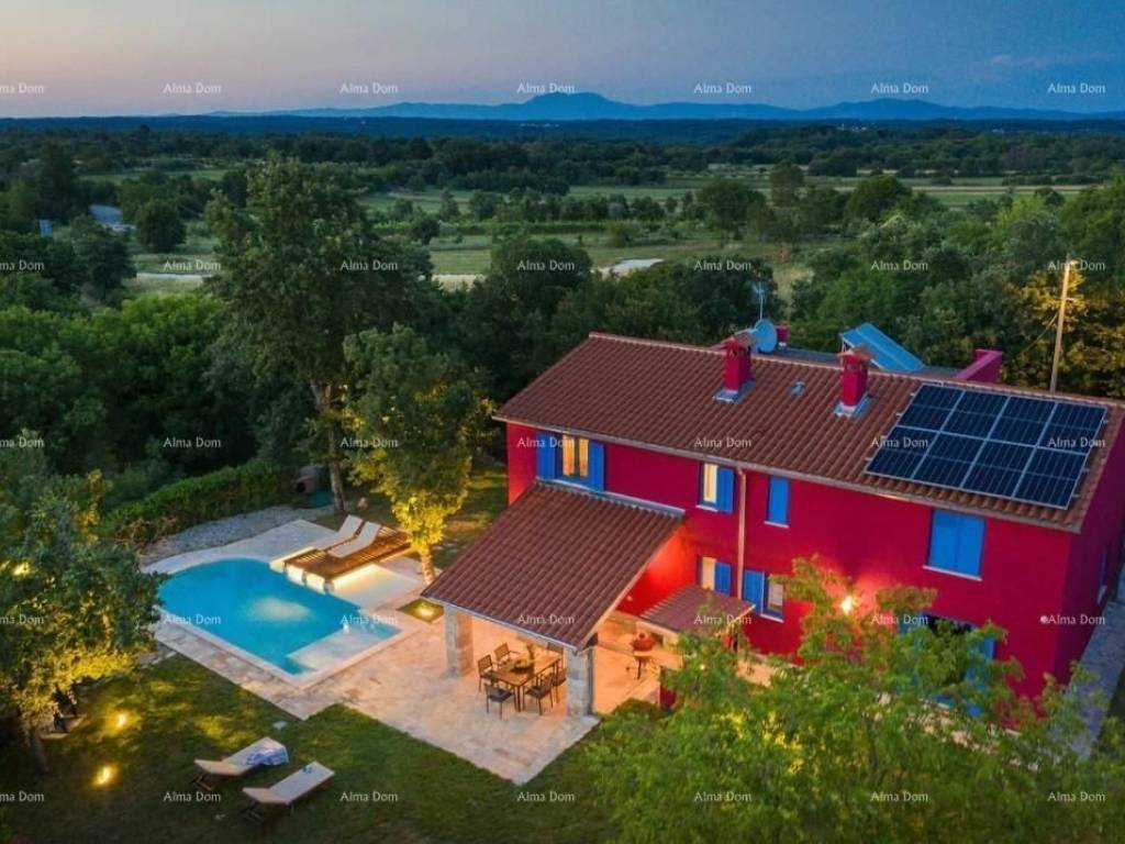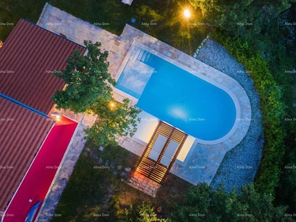 A beautiful house located in a small Istrian village near Barban!A house of 320 m2 with a heated pool, hot tub, and sauna is for sale in the vicinity of Barban.The house consists of 2 floors, the ground floor, and the first floor.The ground floor consists of an open space kitchen with a dining room and a living room, two bedrooms with their bathrooms, a wellness room with a jacuzzi and a sauna, a children"s playroom, and a toilet.There is a fireplace in the living room, and the house is equipped with air conditioning and underfloor heating. In addition, the house has a solar power plant, which significantly reduces electricity costs.On the first floor, there is a master bedroom with a bathroom, a leisure room with a pinball machine a sofa bed, and a large terrace with seating.Large terrace located in the north-east direction and sheltered from the sun in the afternoon.The large garden of 874 m2 includes a beautiful swimming pool surrounded by trees and nature. The pool is heated and has a constant temperature of 23 C.There is also an outdoor kitchen with a barbecue and a dining area by the pool on the garden plot, and it provides a nice place for gatherings with family and friends.In addition, there is an additional 24 m2 of space intended for a children"s playroom. The house and spacious garden will provide you with complete privacy and relaxation.The nearest beach is 10 km away.The house has a charger for electric vehicles and was renovated in 2022.Azra+385 91 611 5706+385 98 420 885azra@almadominvest.com