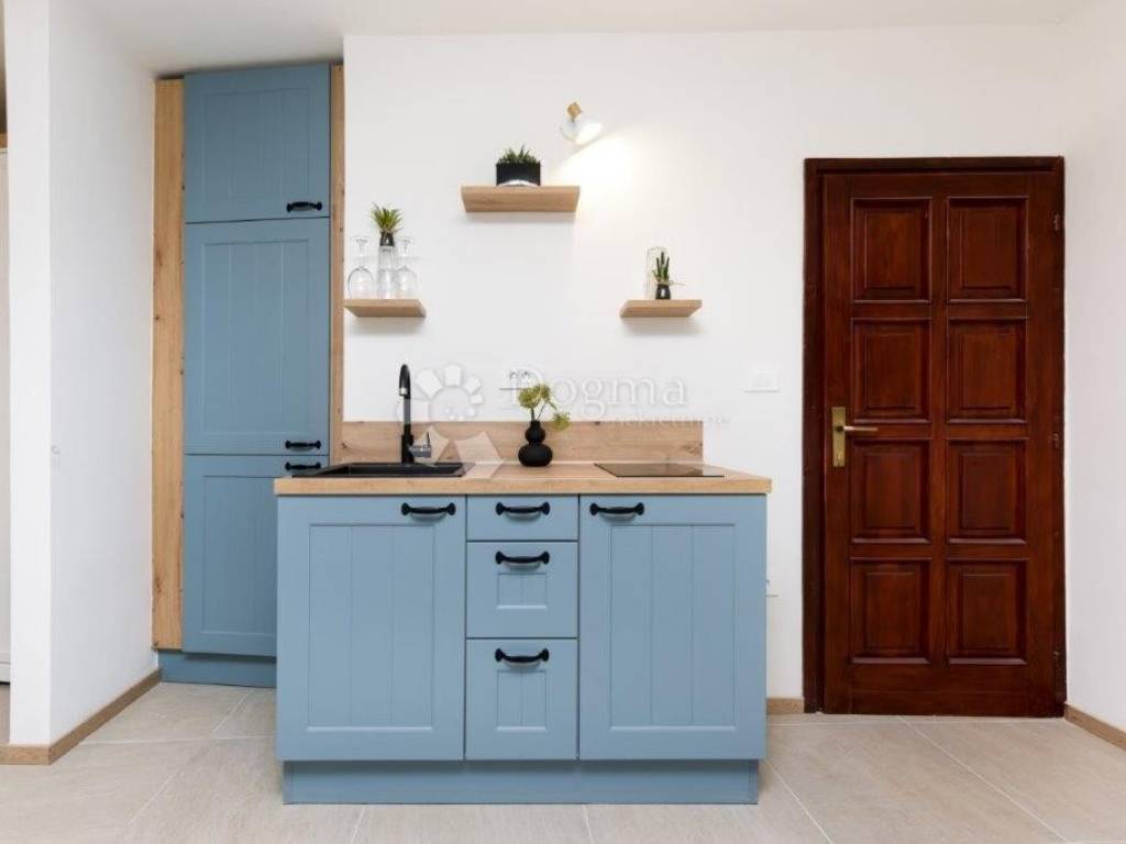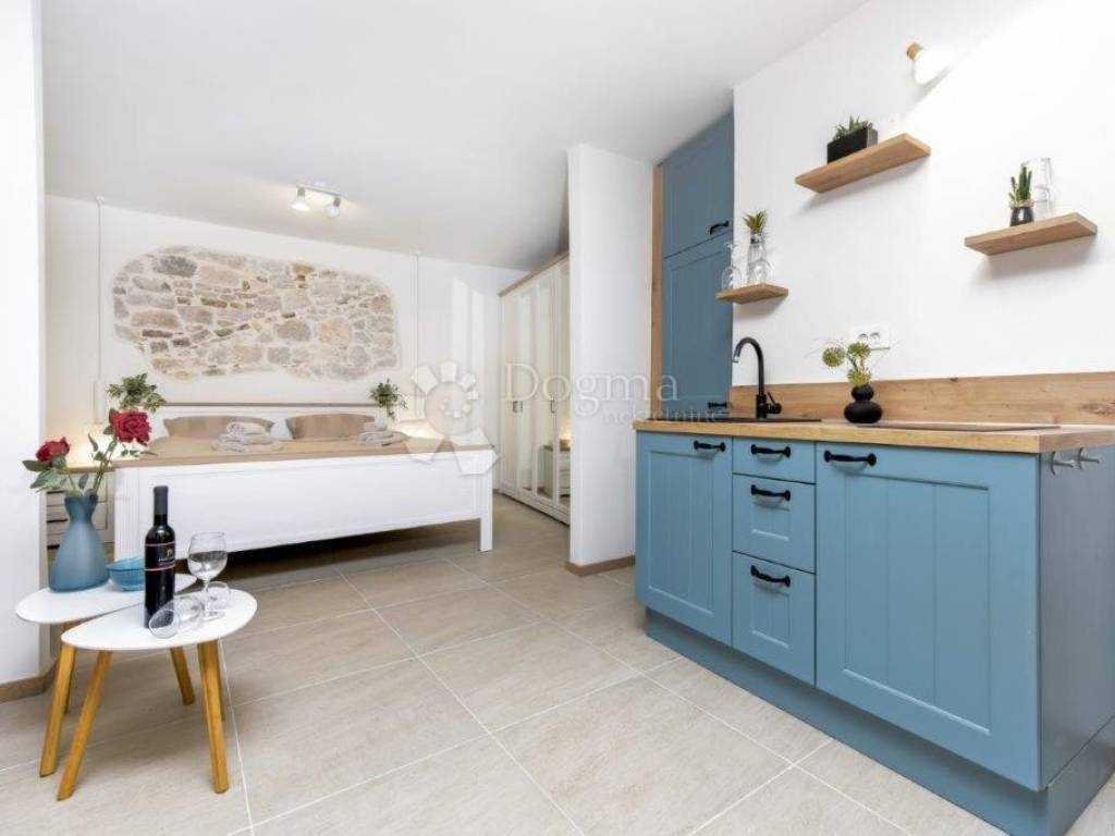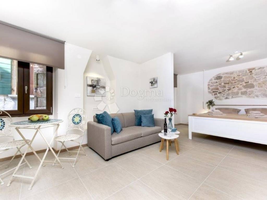 In the very heart of Rovinj, on the second floor of a renovated stone house, we are selling an apartment that radiates its "smoothie charm" and warmth, a modern representation of ordinary life in the center of Rovinj. Located in a quiet street in the historic center, and only 400 meters from the sea and the beach where almost all the kids from the city grew up.
