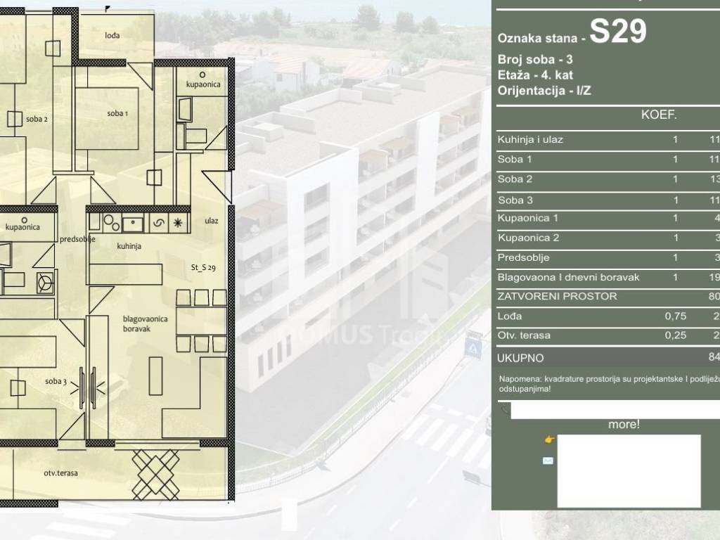 For sale is an apartment marked S29, located on the 4th floor of a residential building under construction. The apartment consists of an entrance and kitchen, hallway, dining room and living room, three bedrooms, two bathrooms, a loggia and an open terrace. The total area of the apartment is 84.75 m, of which 80.00 m is indoor living space, while the loggia with an area of 2.05 m and the open terrace with an area of 2.70 m are included in the calculation according to the coefficient. The apartment is oriented to the east and west.