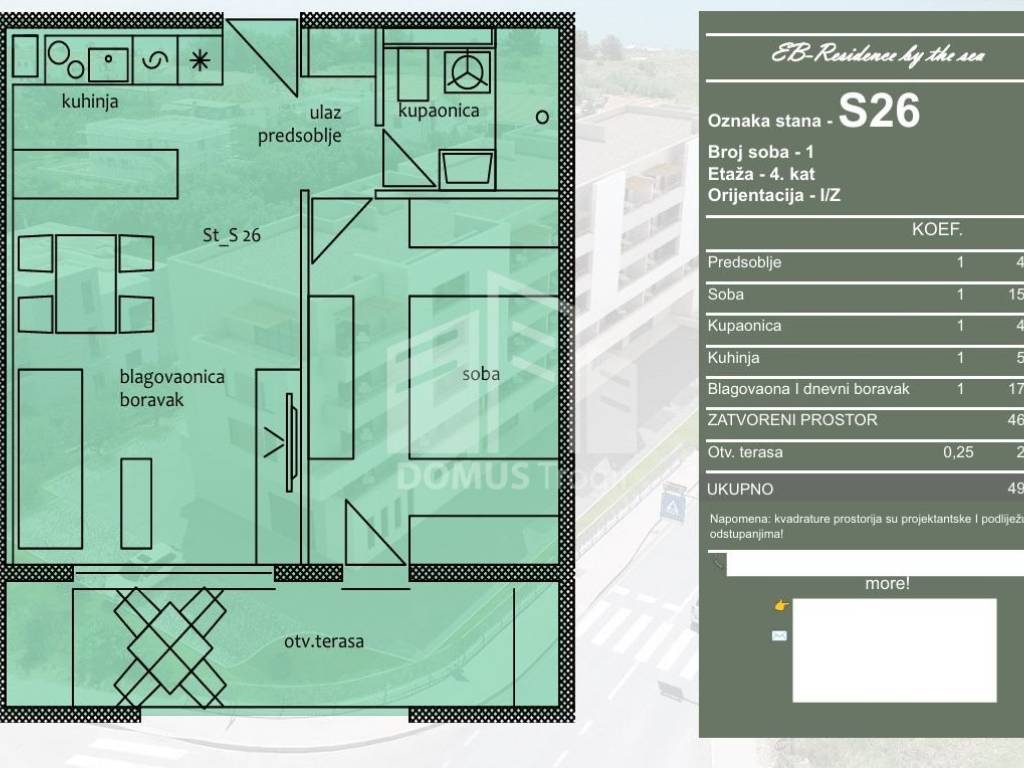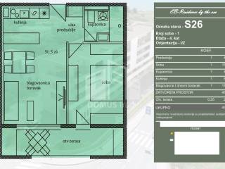 For sale is an apartment marked S26, located on the 4th floor of a residential building under construction. The apartment consists of a hallway, kitchen, dining room and living room, one bedroom, bathroom and an open terrace. The total area of the apartment is 49.00 m, of which 46.35 m is indoor living space, while the open terrace with an area of 2.65 m is included in the calculation according to the coefficient. The apartment is oriented to the east and west.