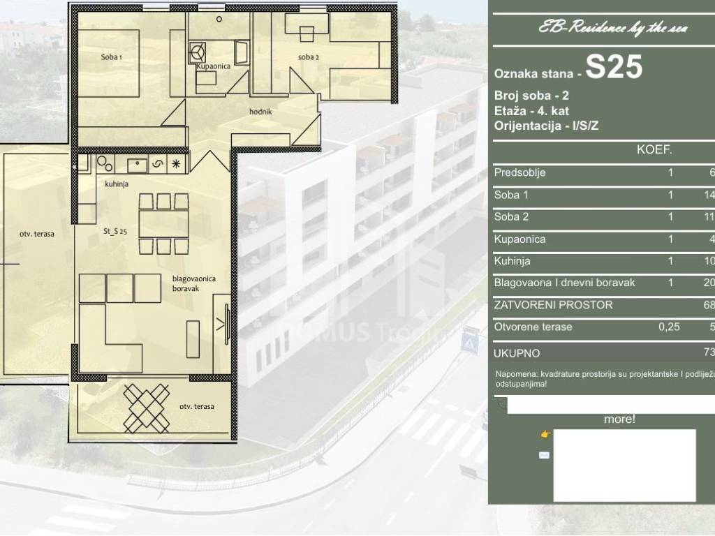 For sale is an apartment marked S25, located on the 4th floor of a residential building under construction. The apartment consists of a hallway, kitchen, dining room and living room, two bedrooms, bathroom, hallway and open terraces. The total area of the apartment is 73.50 m, of which 68.25 m is indoor living space, while the open terraces with a total area of 5.25 m are included in the calculation according to the coefficient. The apartment is oriented to the east, south and west.