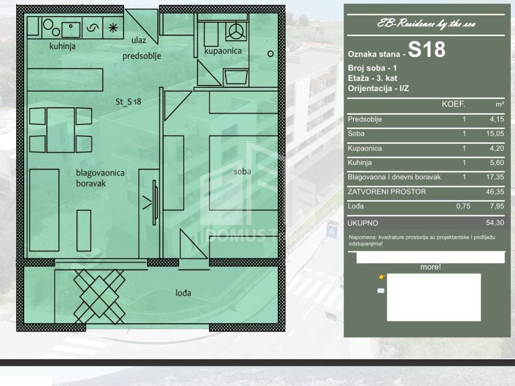 For sale is an apartment marked S18, located on the 3rd floor of a residential building under construction. The apartment consists of a hallway, kitchen, dining room and living room, one bedroom, bathroom and loggia. The total calculated area of the apartment is 54.30 m, of which 46.35 m is closed living space, while the loggia of 7.95 m is included in the calculation according to the coefficient. The apartment is oriented to the east and west.