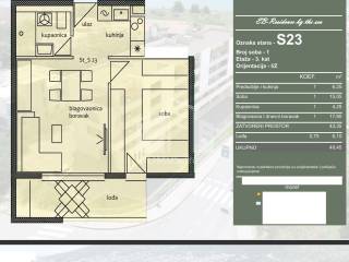 For sale is an apartment marked S23, located on the 3rd floor of a residential building under construction. The apartment consists of an entrance hall with a kitchen, dining room and living room, one bedroom, bathroom and a loggia. The total calculated area of the apartment is 49.45 m, of which 43.35 m is closed living space, while the loggia of 6.10 m is included in the calculation according to the coefficient. The apartment is oriented to the east and west.