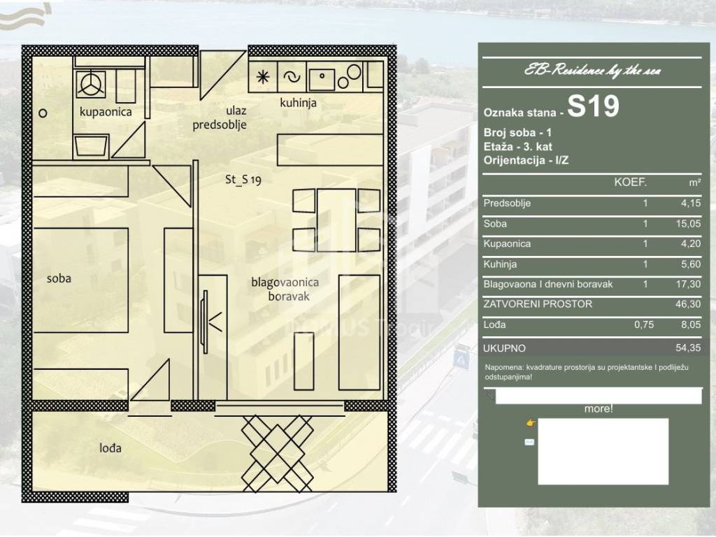 For sale is an apartment marked S19, located on the 3rd floor of a residential building under construction. The apartment consists of a hallway, kitchen, dining room and living room, one bedroom, bathroom and loggia. The total calculated area of the apartment is 54.35 m, of which 46.30 m is closed living space, while the loggia of 8.05 m is included in the calculation according to the coefficient. The apartment is oriented to the east and west.
