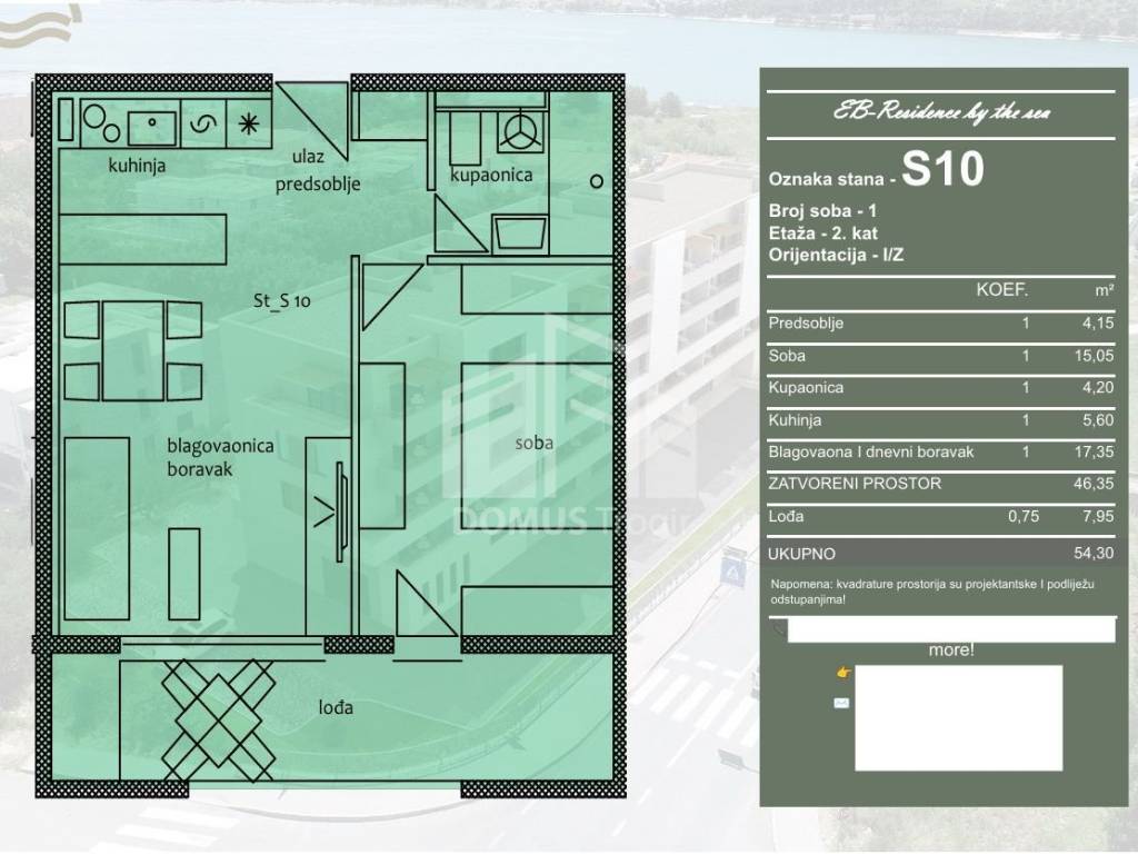For sale is an apartment marked S10, located on the 2nd floor of a residential building under construction. The apartment consists of a hallway, kitchen, dining room and living room, one bedroom, bathroom and loggia. The total calculated area of the apartment is 54.30 m, of which 46.35 m is closed living space, while the loggia of 7.95 m is included in the calculation according to the coefficient. The apartment is oriented to the east and west.