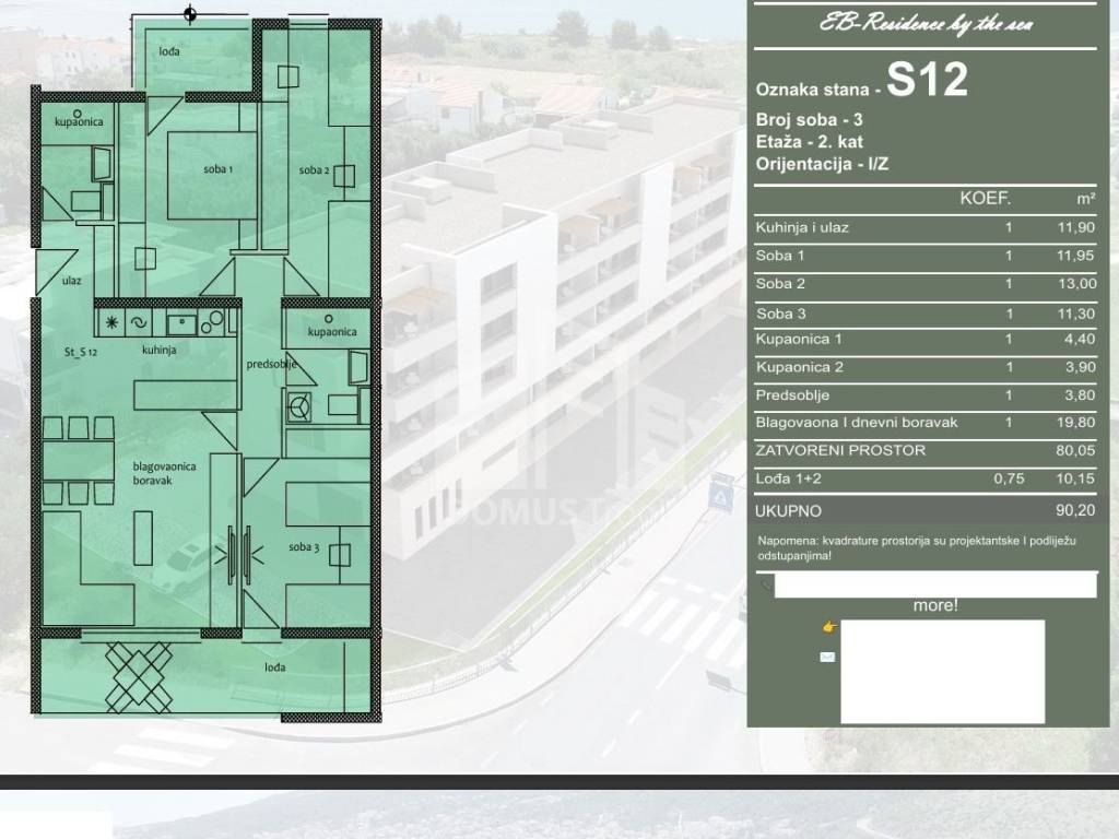For sale is an apartment marked S12, located on the 2nd floor of a residential building under construction. The apartment consists of an entrance and kitchen, hallway, dining room and living room, three bedrooms, two bathrooms and two loggias. The total calculated area of the apartment is 90.20 m, of which 80.05 m is closed living space, while the loggias with a total area of 10.15 m are included in the calculation according to the coefficient. The apartment is oriented to the east and west.