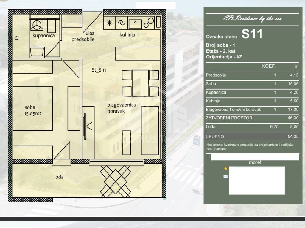 For sale is an apartment marked S11, located on the 2nd floor of a residential building under construction. The apartment consists of a hallway, kitchen, dining room and living room, one bedroom, bathroom and loggia. The total calculated area of the apartment is 54.35 m, of which 46.30 m is closed living space, while the loggia of 8.05 m is included in the calculation according to the coefficient. The apartment is oriented to the east and west.