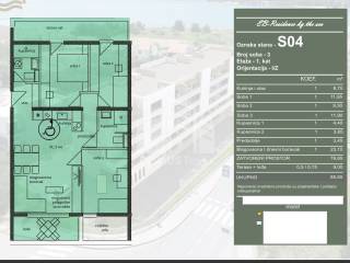 For sale is an apartment marked S04, located on the 1st floor of a residential building under construction. The apartment consists of an entrance and kitchen, hallway, dining room and living room, three bedrooms, two bathrooms, a loggia and a terrace. The total area of the apartment is 85.65 m, of which 76.65 m is indoor living space, while the terrace and loggia with a total area of 9.00 m are included in the calculation according to the coefficient. The apartment is oriented to the east and west.