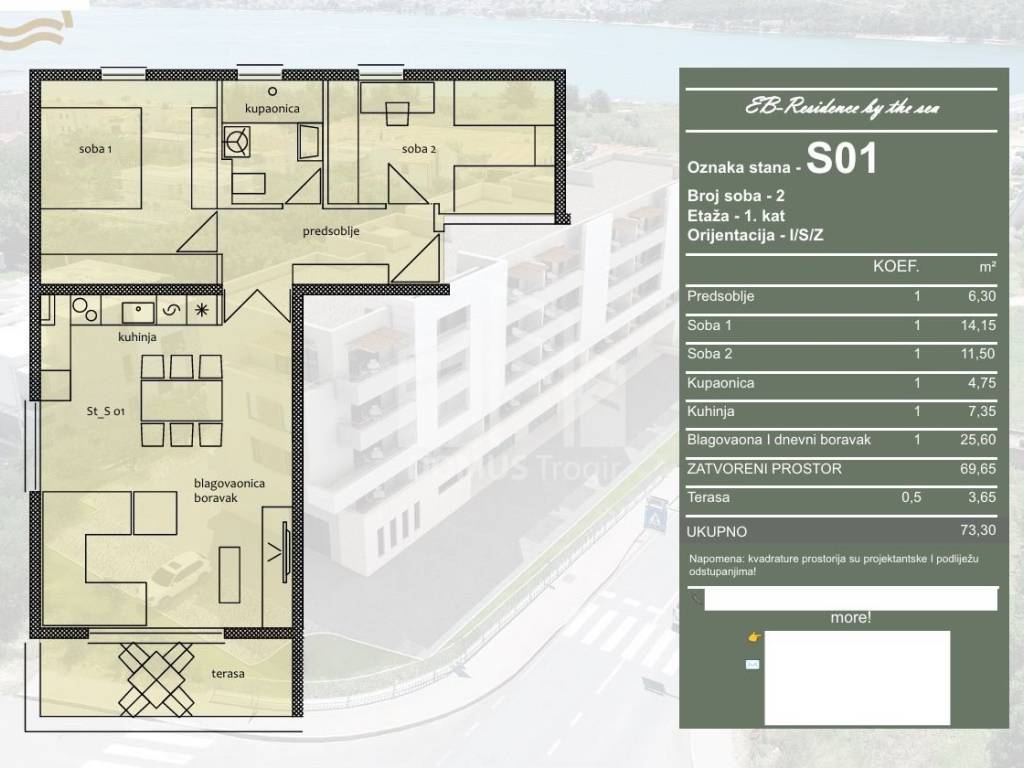 For sale is a modern and functional two-bedroom apartment marked S01, located on the first floor of a modern residential building, in a quiet environment and near the sea. The apartment consists of an entrance hall, kitchen, dining room and living room with access to a terrace, two bedrooms and a bathroom. The total area of the apartment is 73.30 m, of which 69.65 m is closed living space, while the terrace of 3.65 m additionally contributes to a pleasant stay and a sense of space. The apartment is oriented to the east, south and west, which ensures plenty of natural light throughout the day.