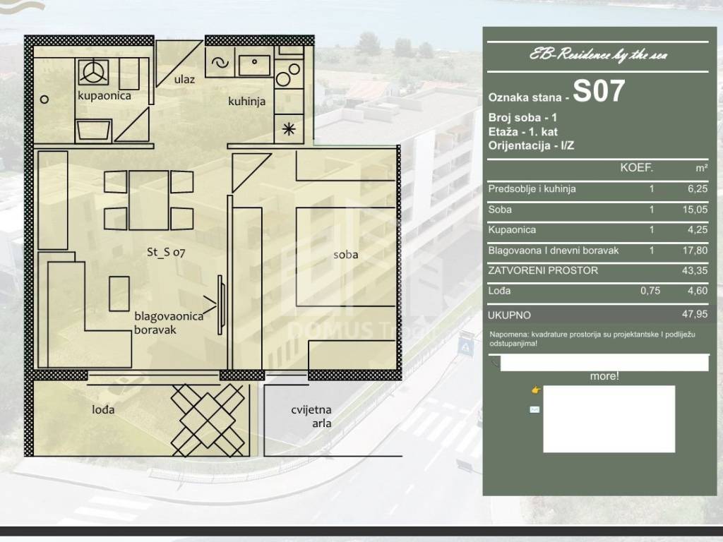 For sale is an apartment marked S07, located on the 1st floor of a residential building under construction. The apartment consists of an entrance hall with a kitchen, dining room and living room, one bedroom, bathroom and a loggia. The total calculated area of the apartment is 47.95 m, of which 43.35 m is closed living space, while the loggia of 4.60 m is included in the calculation according to the coefficient. The apartment is oriented to the east and west.
