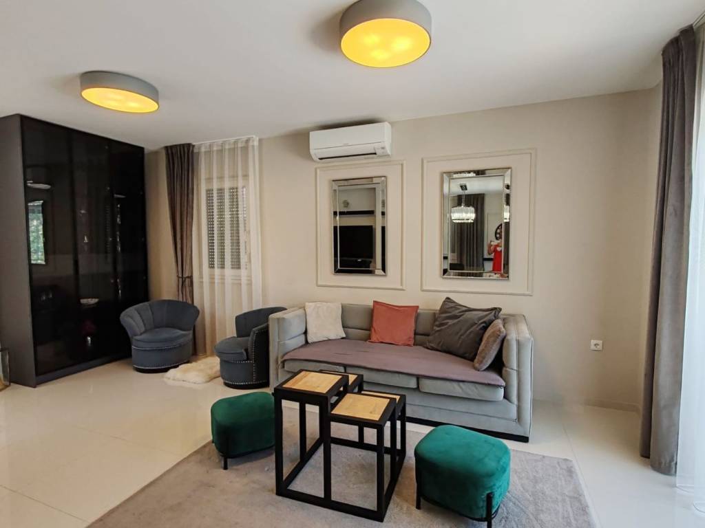 The house is fully furnished with high-quality, custom-made furniture. It comes with two covered parking spaces, while on the 172 m² plot it is possible to park two more vehicles. An outdoor fireplace is also located in the garden.