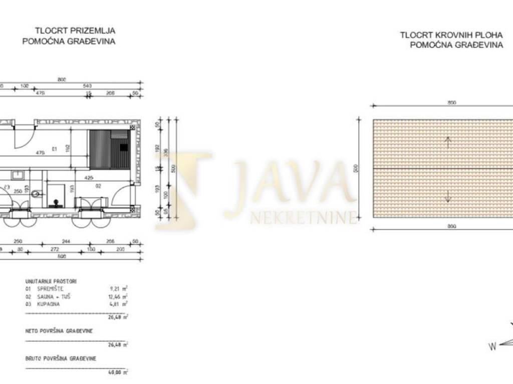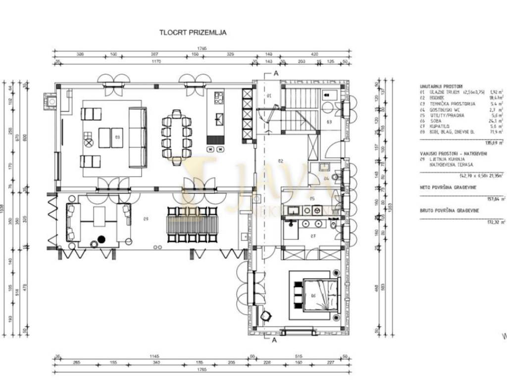 prizemlje: prostrani dnevni boravak s kuhinjom i blagovaonicom, izlaz na južno orijentiranu natkrivenu terasu, spavaća soba, kupaonica, WC, utility i servisne prostorije