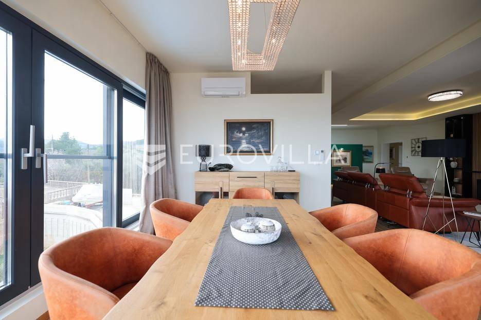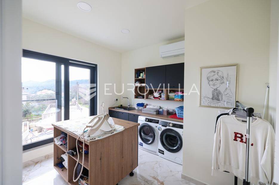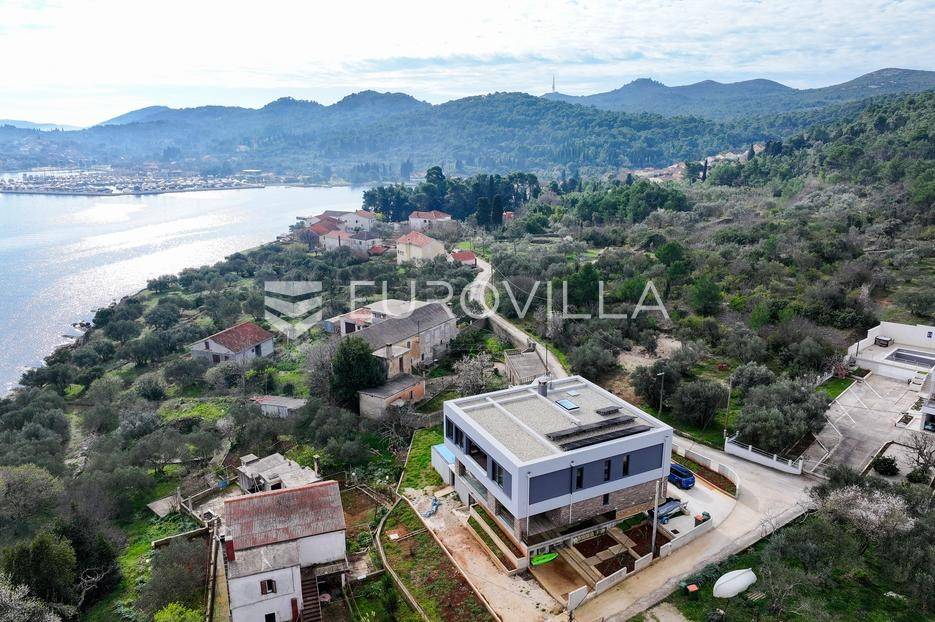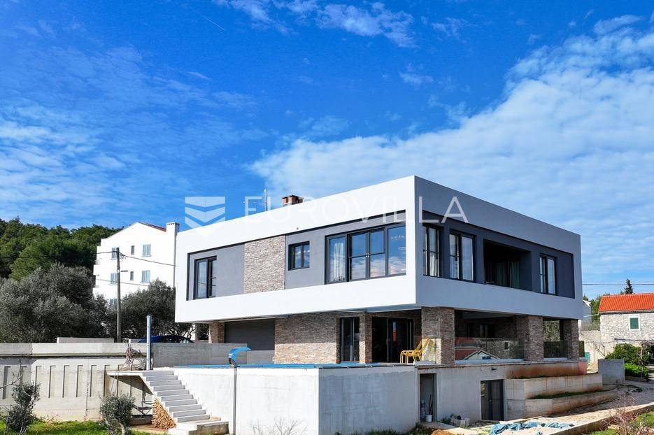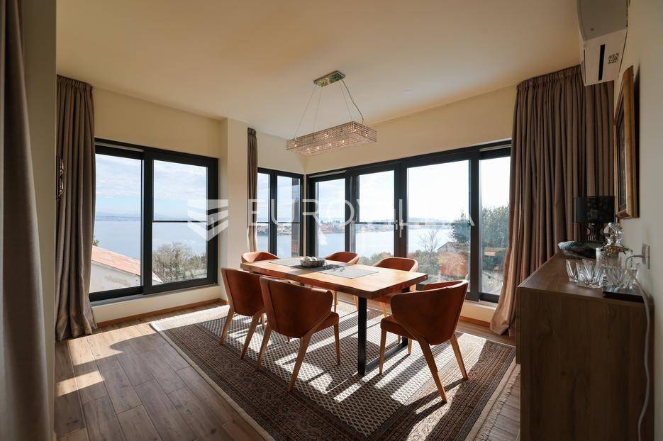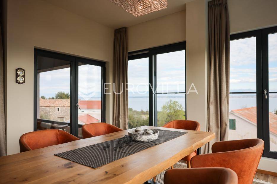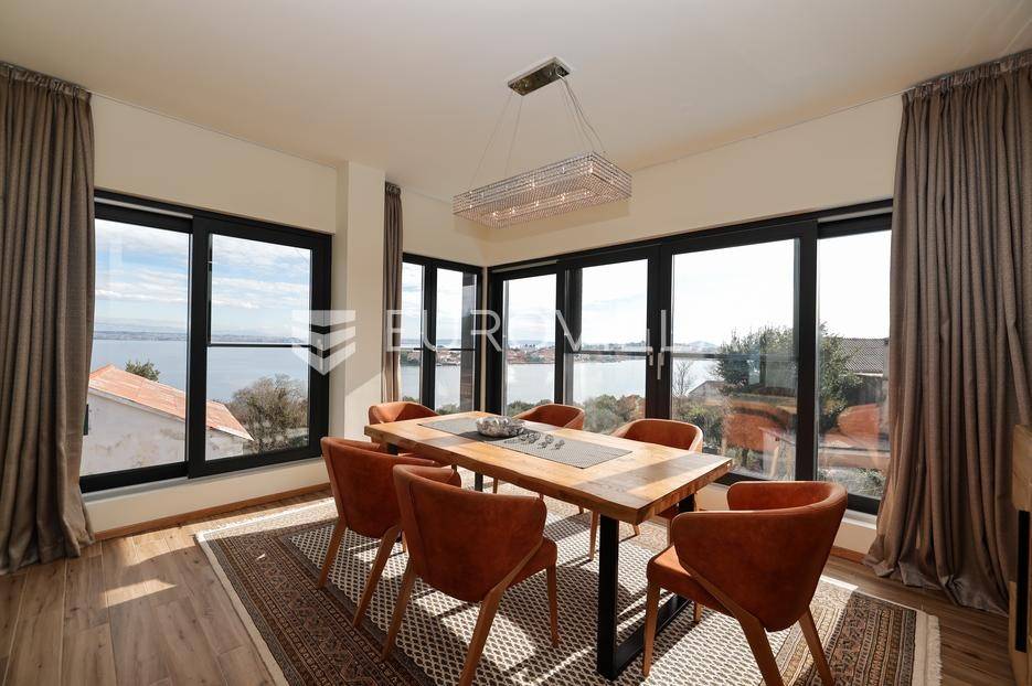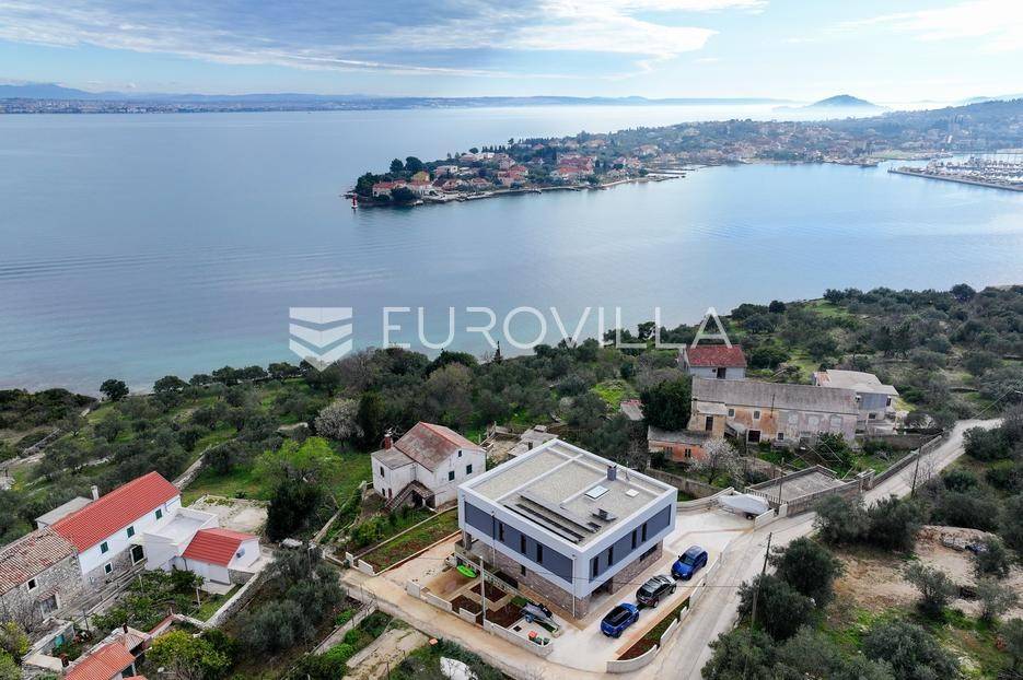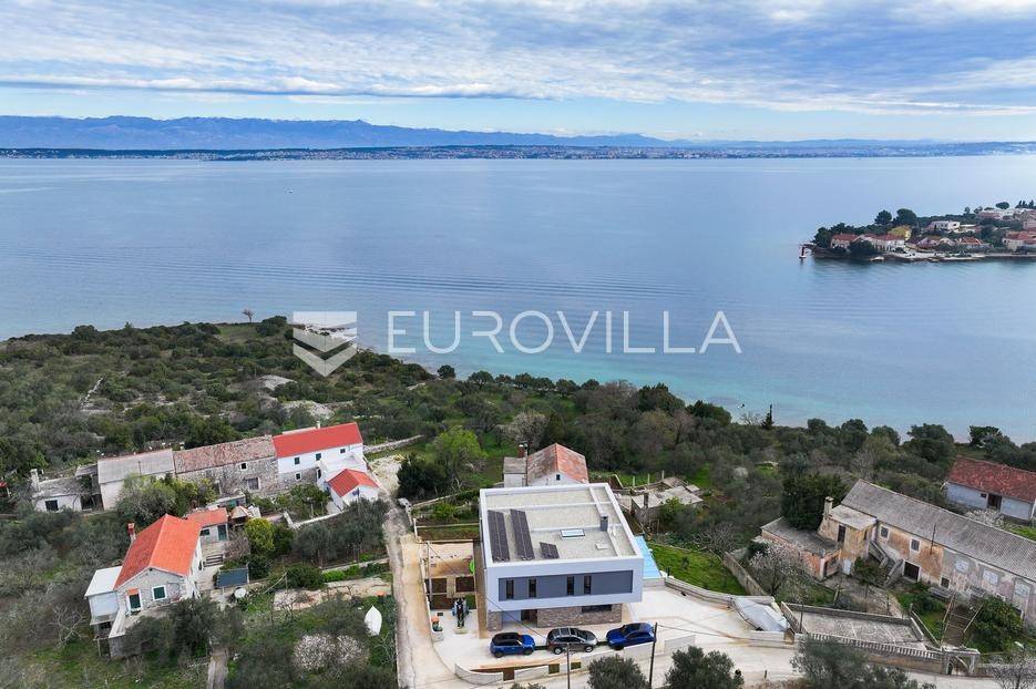 Ova jedinstvena dizajnerska vila smjestila se na otoku Ugljanu, u mjestu Lukoran.Prostire se na zemljištu površine 1061 m2.Prizemlje se sastoji od ulaznog prostora, gostinjske spavaće sobe, kupaonice, te natkrivene terase površine 60,4 m2. U prizemlju se nalazi i sauna, ljetna kuhinja s kominom te garaža za dva vozila.Na prvom katu nalazi se master soba sa vlastitom kupaonicom i garderobom te izlazom na terasu, koja povezuje dnevni boravak i blagovaonicu. Vila ima i lift koji povezuje podrum, prizemlje i prvi kat.Prostrani dnevni boravak, kuhinja i blagovaonica su otvorenog koncepta. Na istoj etaži nalaze se još jedna spavaća soba, kupaonica, radna soba, spremište i praonica.S terase i dnevnog boravka pruža se prekrasan pogled na more i grad Zadar, a u dvorištu se nalazi i bazen.Prostrani podrum proteže se duž cijele etaže.Vila je vrhunski i kvalitetno opremljena te nudi potpuni užitak stanovanja i boravka u prostoru.Uz potpuno namještenu i opremljenu vilu dolazi i jet ski te vez za brod.Izuzetna lokacija uz more, jedinstven pogled i zelenilo ovu vilu čine izuzetnom prilikom na tržištu nekretninama.Više informacija na upit.