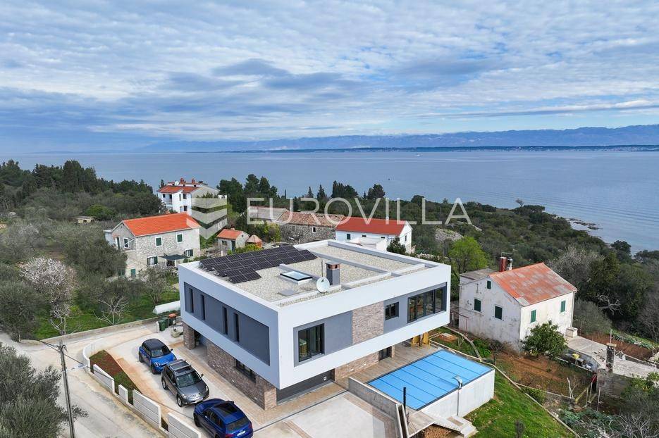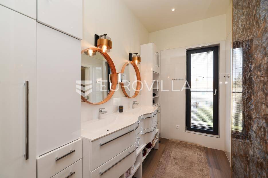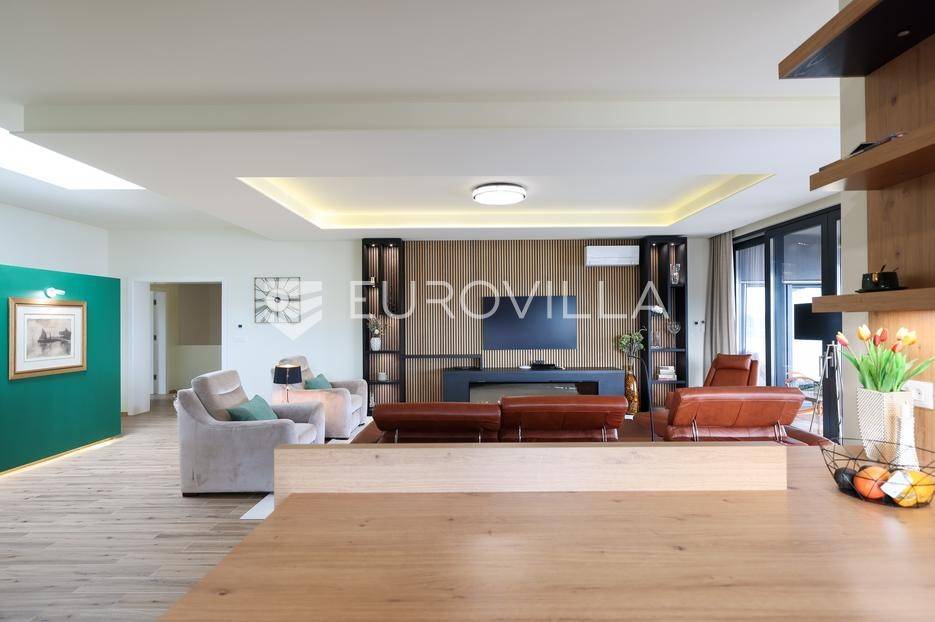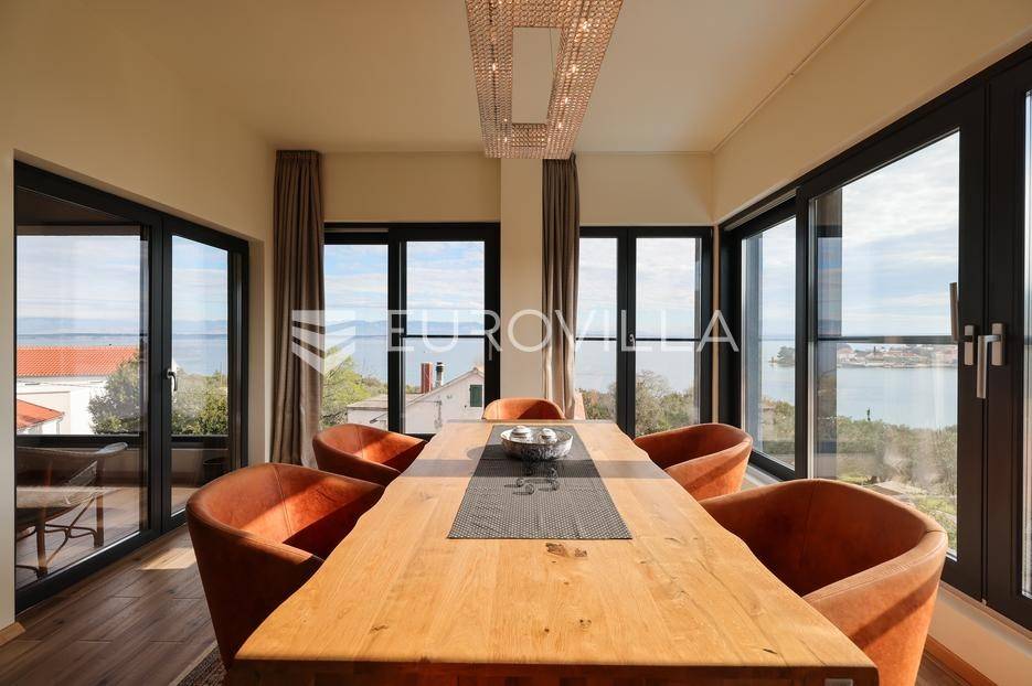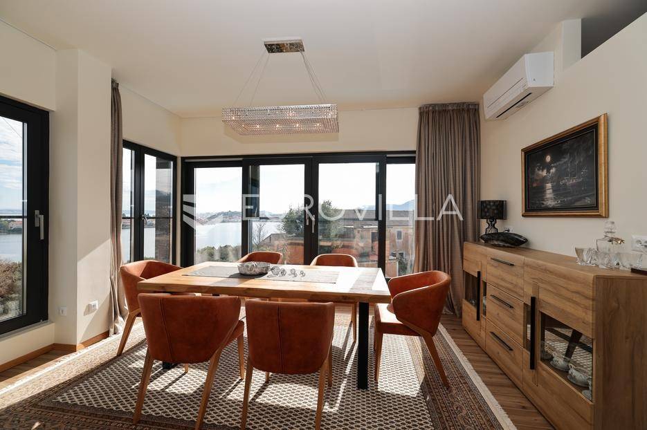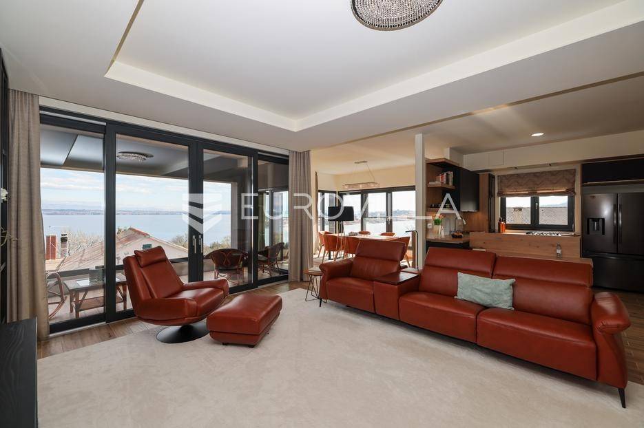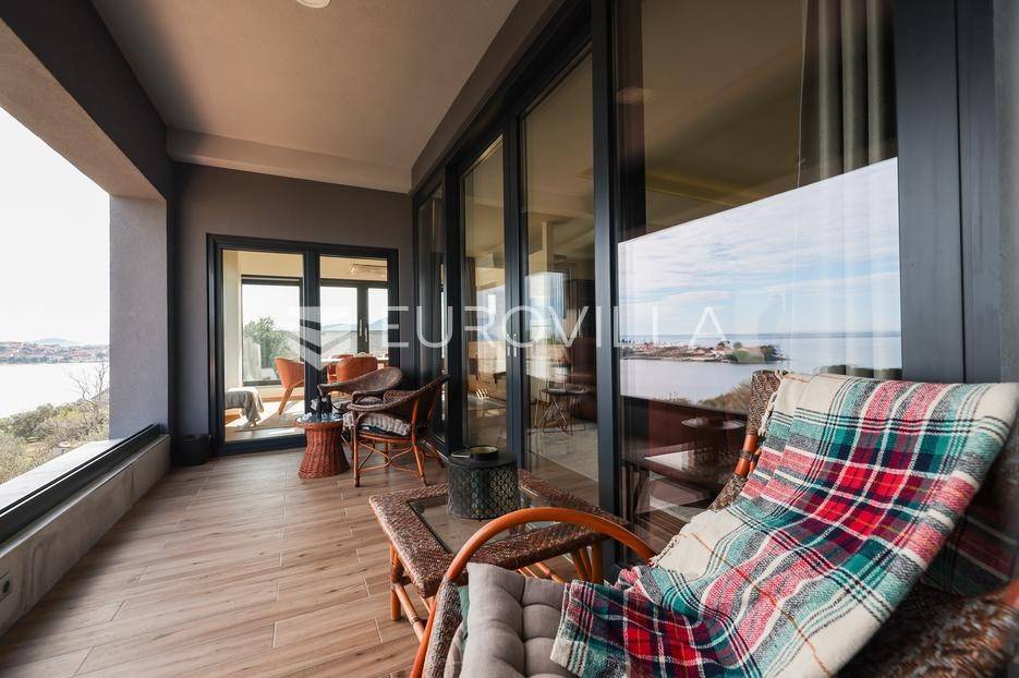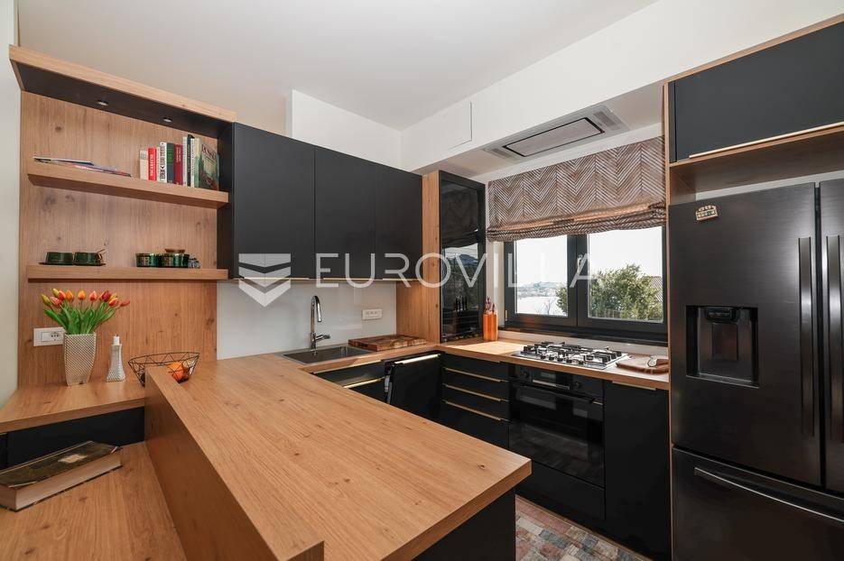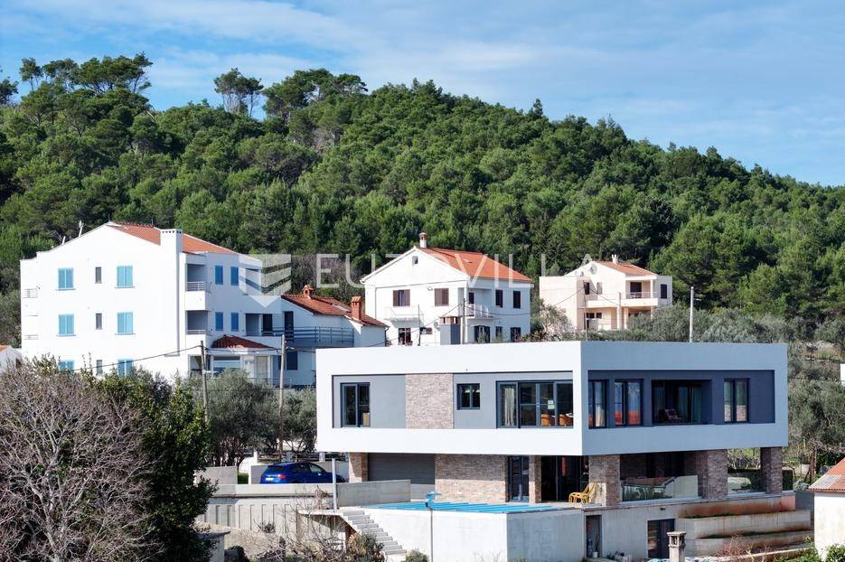 Ova jedinstvena dizajnerska vila smjestila se na otoku Ugljanu, u mjestu Lukoran.Prostire se na zemljištu površine 1061 m2.Prizemlje se sastoji od ulaznog prostora, gostinjske spavaće sobe, kupaonice, te natkrivene terase površine 60,4 m2. U prizemlju se nalazi i sauna, ljetna kuhinja s kominom te garaža za dva vozila.Na prvom katu nalazi se master soba sa vlastitom kupaonicom i garderobom te izlazom na terasu, koja povezuje dnevni boravak i blagovaonicu. Vila ima i lift koji povezuje podrum, prizemlje i prvi kat.Prostrani dnevni boravak, kuhinja i blagovaonica su otvorenog koncepta. Na istoj etaži nalaze se još jedna spavaća soba, kupaonica, radna soba, spremište i praonica.S terase i dnevnog boravka pruža se prekrasan pogled na more i grad Zadar, a u dvorištu se nalazi i bazen.Prostrani podrum proteže se duž cijele etaže.Vila je vrhunski i kvalitetno opremljena te nudi potpuni užitak stanovanja i boravka u prostoru.Uz potpuno namještenu i opremljenu vilu dolazi i jet ski te vez za brod.Izuzetna lokacija uz more, jedinstven pogled i zelenilo ovu vilu čine izuzetnom prilikom na tržištu nekretninama.Više informacija na upit.