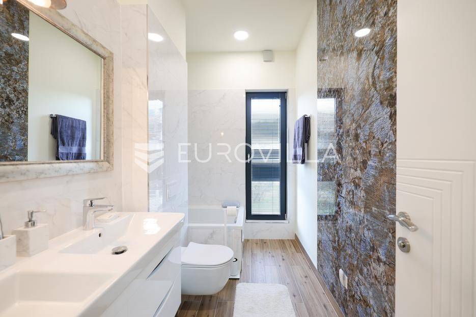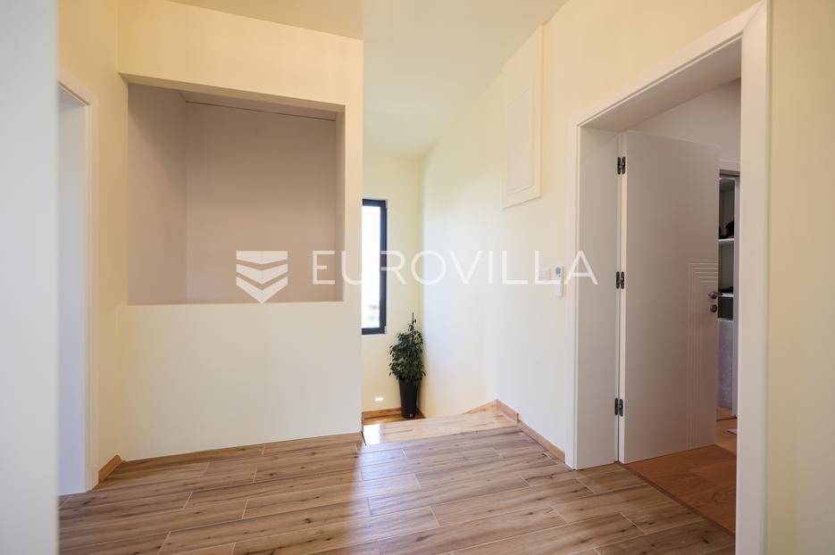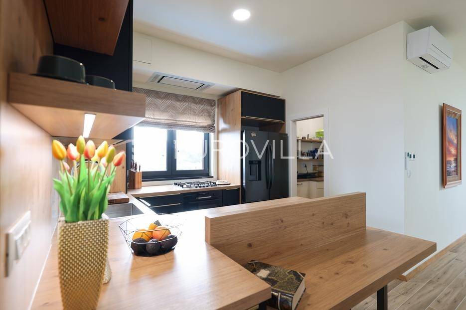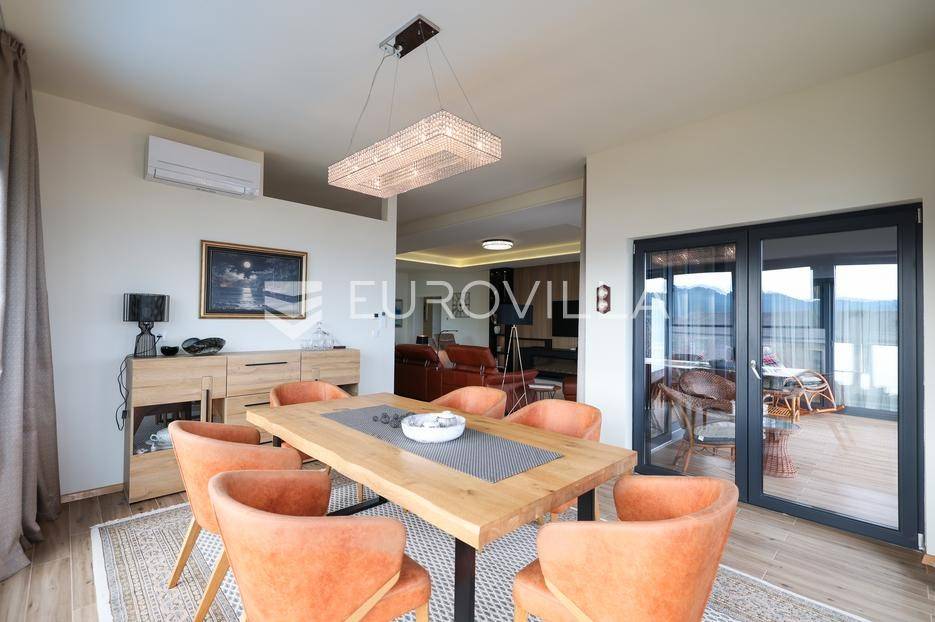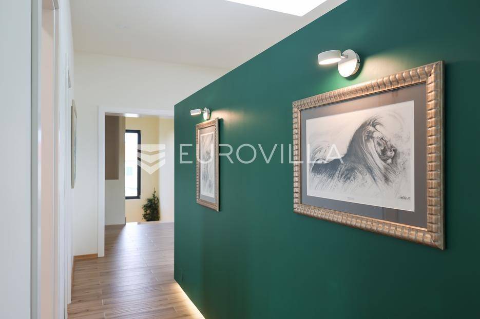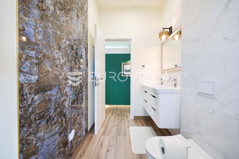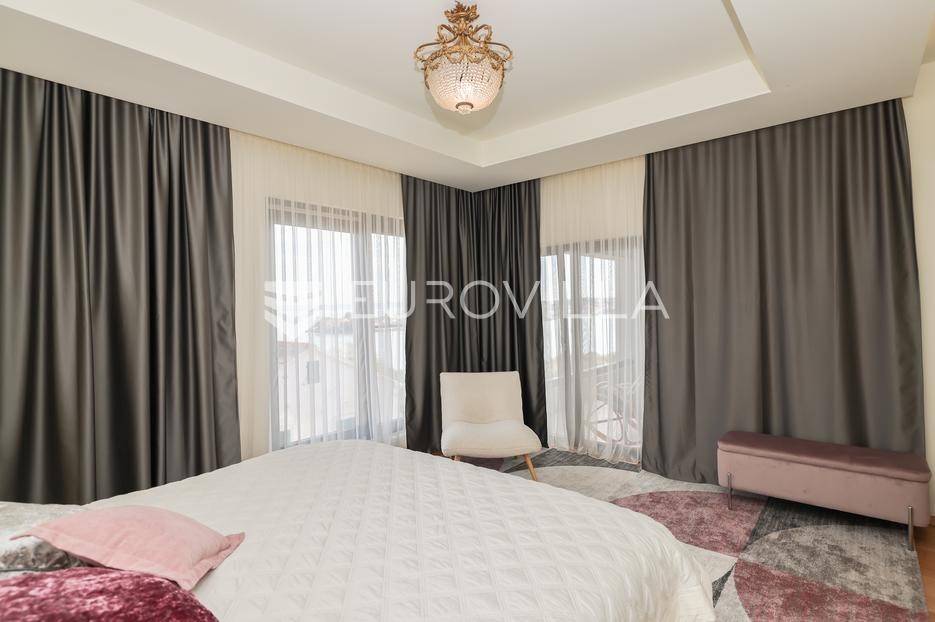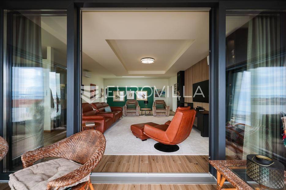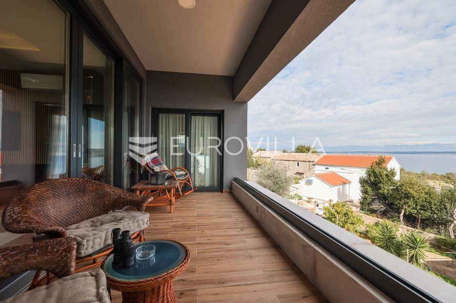 Ova jedinstvena dizajnerska vila smjestila se na otoku Ugljanu, u mjestu Lukoran.Prostire se na zemljištu površine 1061 m2.Prizemlje se sastoji od ulaznog prostora, gostinjske spavaće sobe, kupaonice, te natkrivene terase površine 60,4 m2. U prizemlju se nalazi i sauna, ljetna kuhinja s kominom te garaža za dva vozila.Na prvom katu nalazi se master soba sa vlastitom kupaonicom i garderobom te izlazom na terasu, koja povezuje dnevni boravak i blagovaonicu. Vila ima i lift koji povezuje podrum, prizemlje i prvi kat.Prostrani dnevni boravak, kuhinja i blagovaonica su otvorenog koncepta. Na istoj etaži nalaze se još jedna spavaća soba, kupaonica, radna soba, spremište i praonica.S terase i dnevnog boravka pruža se prekrasan pogled na more i grad Zadar, a u dvorištu se nalazi i bazen.Prostrani podrum proteže se duž cijele etaže.Vila je vrhunski i kvalitetno opremljena te nudi potpuni užitak stanovanja i boravka u prostoru.Uz potpuno namještenu i opremljenu vilu dolazi i jet ski te vez za brod.Izuzetna lokacija uz more, jedinstven pogled i zelenilo ovu vilu čine izuzetnom prilikom na tržištu nekretninama.Više informacija na upit.