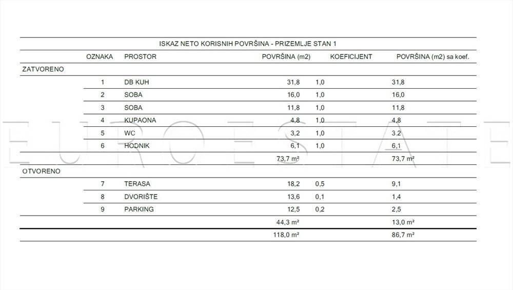 PRODAJE SE trosoban stan u ekskluzivnoj novogradnji smješten u prizemlju urbane vile, ukupne površine 118 m2 i neto korisne (obračunske) površine 86.70 m2.