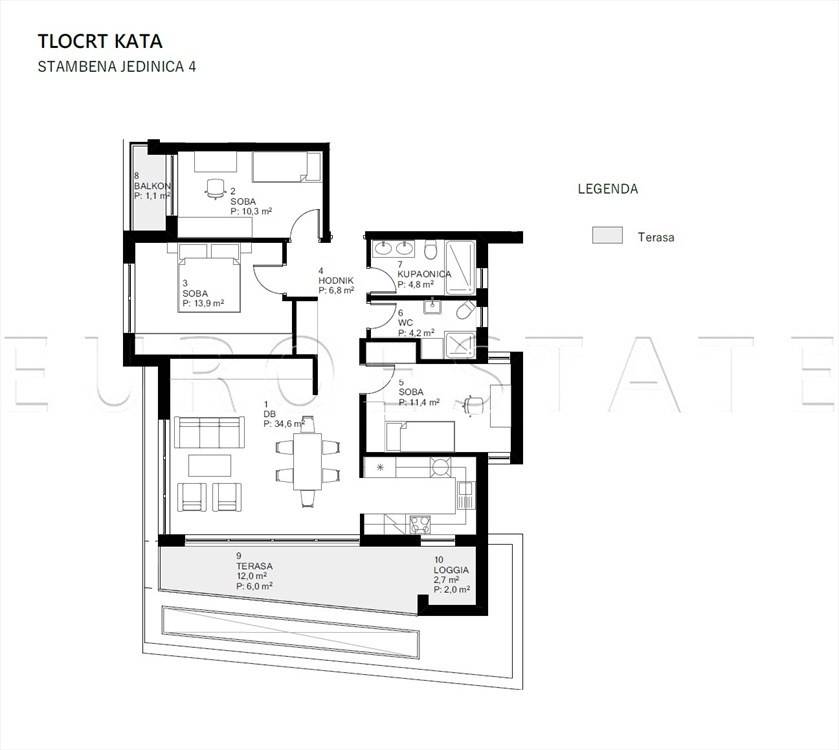 PROSTORIJE STANA: vidjeti priloženi tlocrt i popis prostorija sa površinama (STAN 4)