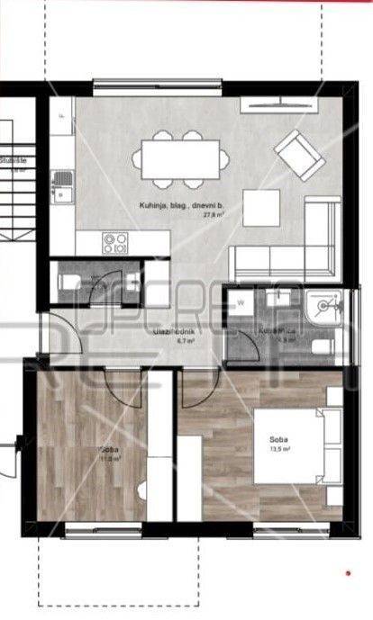 This charming apartment is located on the ground floor and will consist of a living room, dining room and kitchen according to the open space concept, two bedrooms, bathroom and toilet. From the living room and from one bedroom there is an exit directly to the terrace. Its total area is 70.97 m2. Heating of the apartment is provided by air conditioning and underfloor heating on electricity. Each apartment will have two parking spaces. The future owner of the apartment will be able to purchase part of the garden. The planned completion of construction is in the summer of 2025