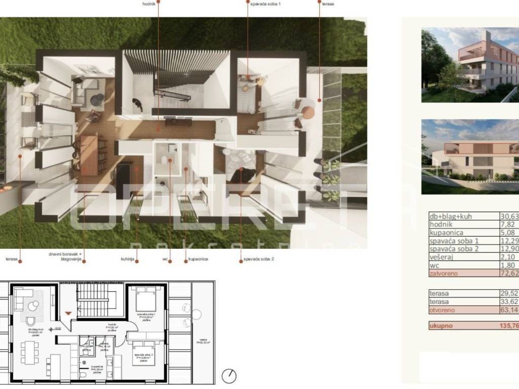 PRODAJA, NOVOGRADNJA, Maksimir, Gorice. Na vrhunskoj lokaciji uz šumu prodaje se projekt sa 3 stambene jedinice. Stan 3 (penthouse) se sastoji od ulaznog hodnika, , 2 spavaće sobe, kupaonice s wcom, posebnog wc-a, vešeraja, dnevnog boravka povezanog sa kuhinjom i blagavaonicom, te 2 terase (natkrivena i nenatkrivena) sveukupne bruto površine 135,76 m2. Uz stan u cijeni dolaze i 2 garažna parkirna mjesta od 25,25 m2 te spremište od 6,60m2 što sveukupno iznosi 167,31 m2 bruto. Koriste vrhunski materijali i oprema (dizalica topline podna grijanja-struja), pročišćivači vode, aluminij stolarija - 3 slojna stakla punjena argonom, priprema za električna vozila, te kupac po svojem izboru bira pločice, parkete i sanitarije. Završetak radova do 01.03.2026 godine! Za sva detaljnija pitanja kontaktirajte nas!