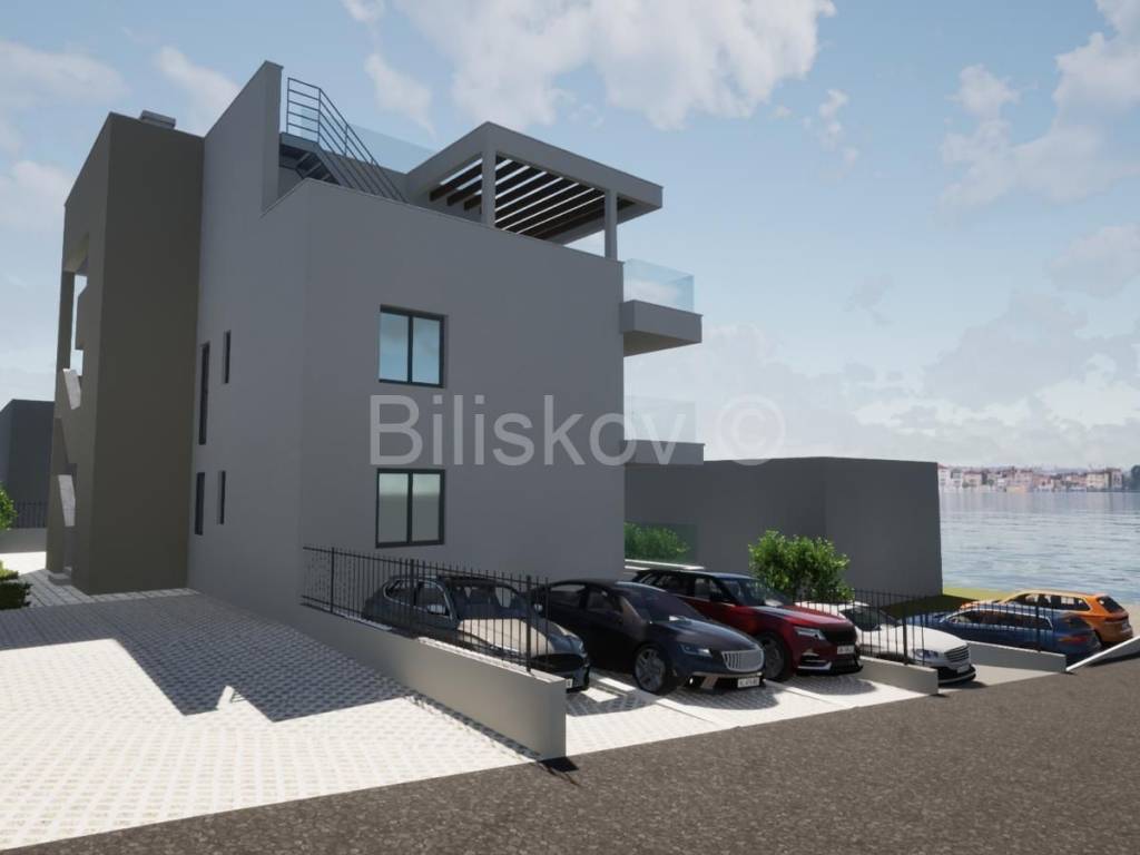 In a highly attractive location in Okrug Gornji on the island of Čiovo, just a few steps from a beautiful pebble beach, a modern two-bedroom apartment is for sale. It is situated on the ground floor of a small residential building currently under construction. The apartment offers a total living area of 57.47 m and features an excellent layout. The price includes one garage parking space, while residents will also have access to an elevator and several outdoor guest parking spaces.