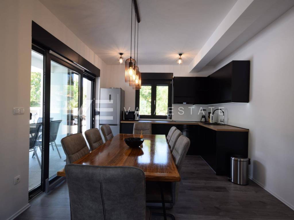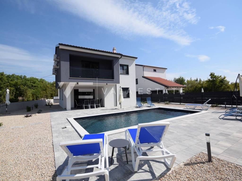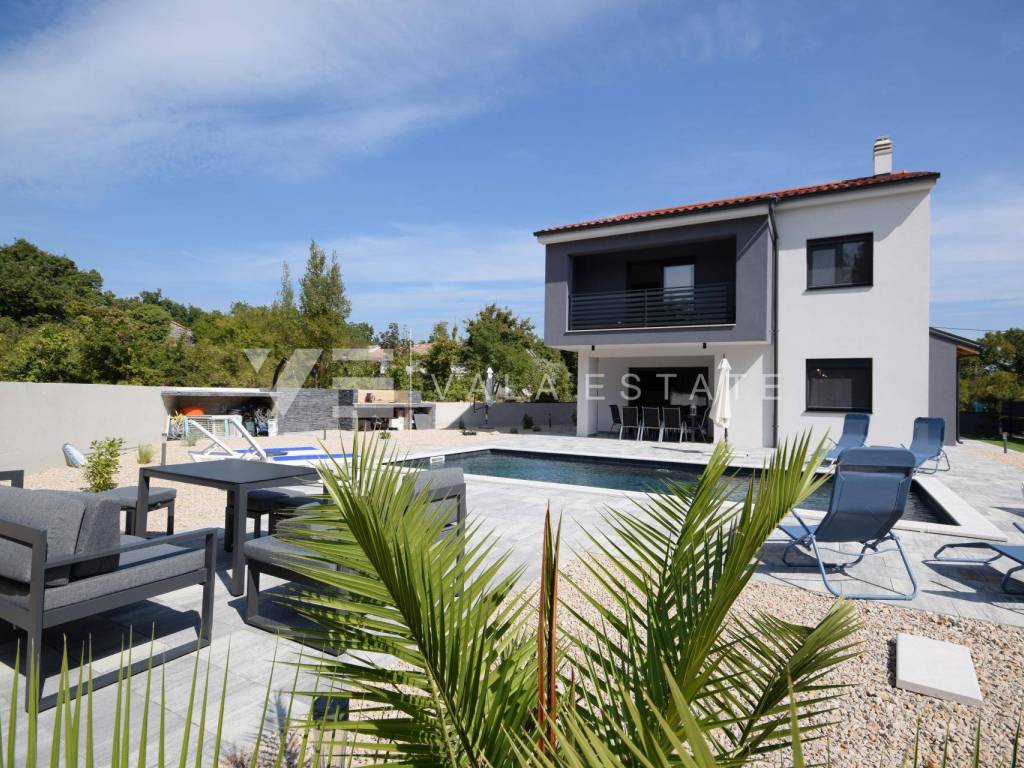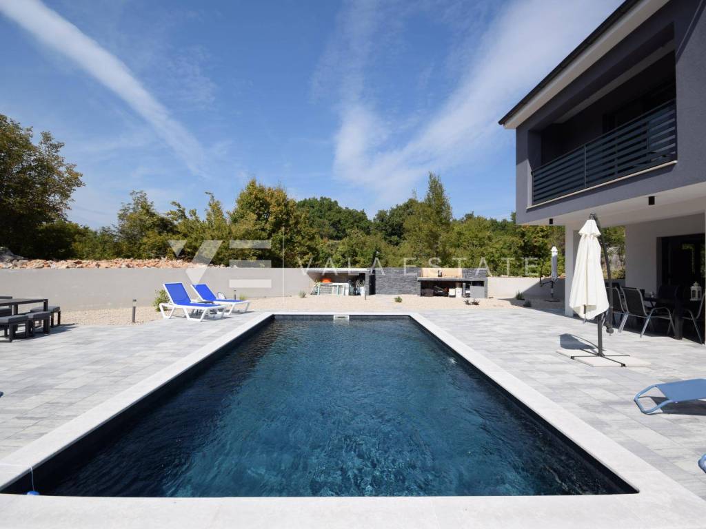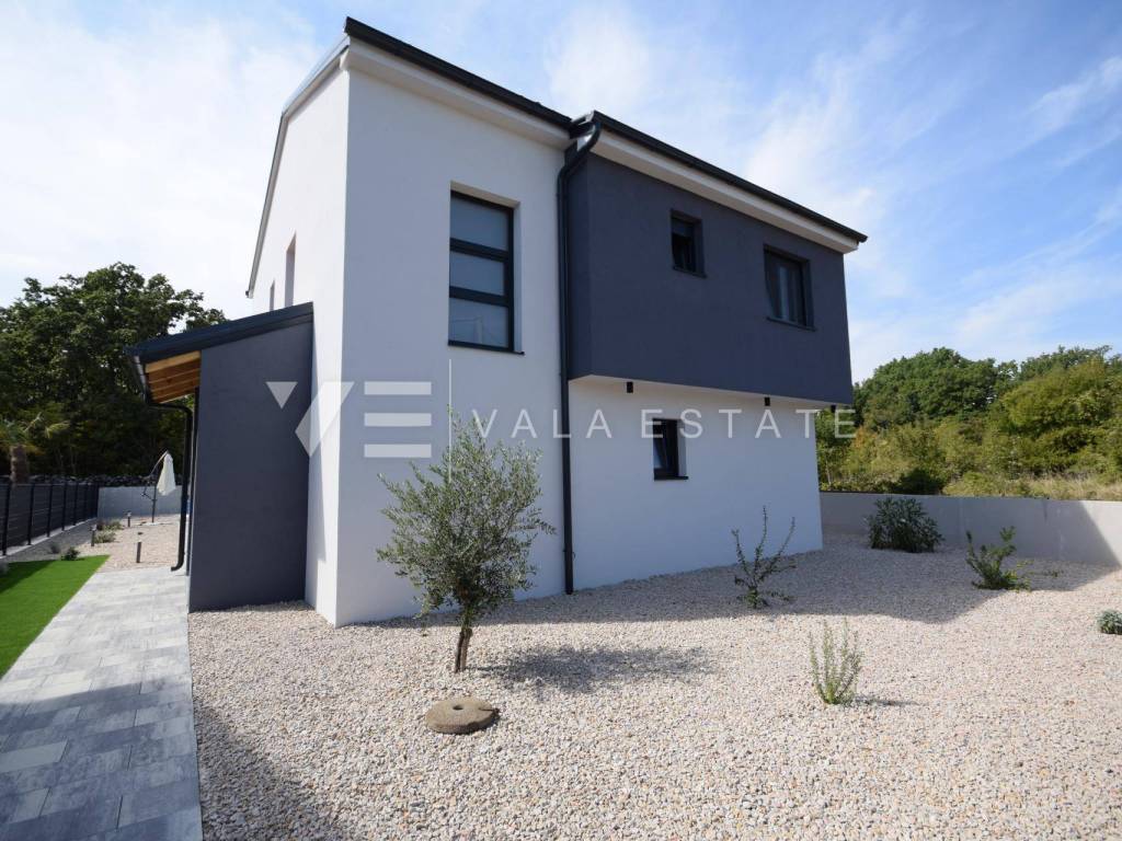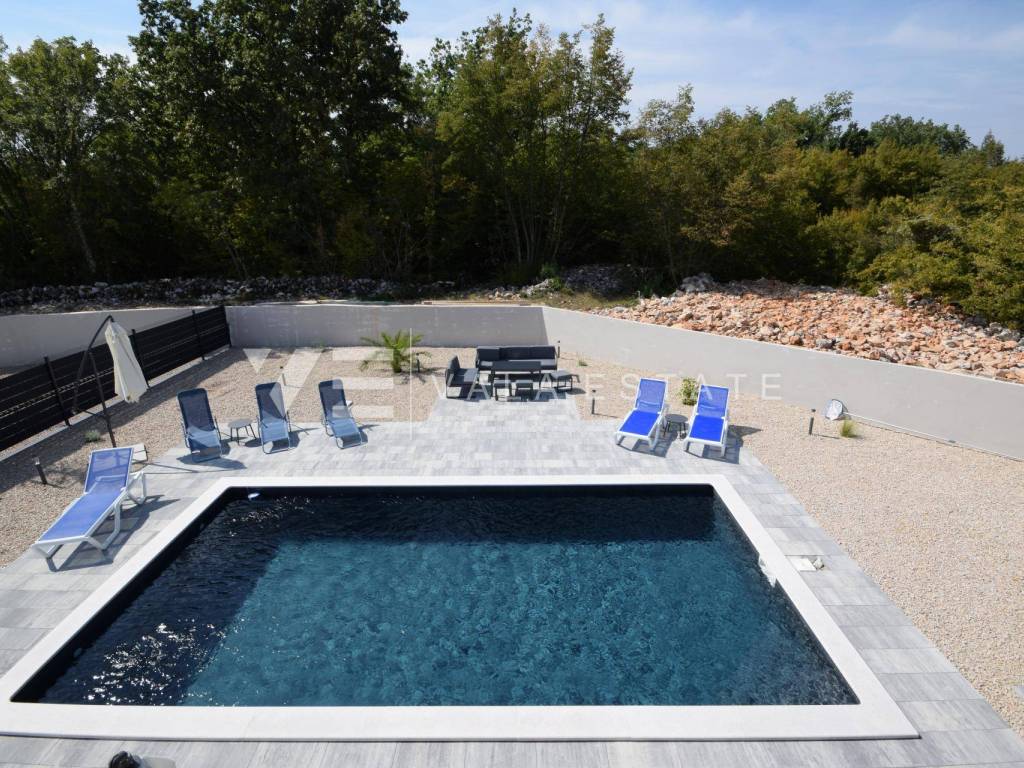 Real estate island of Krk, Dobrinj municipality - in a small quiet place of Dobrinj municipality, in a beautiful position surrounded by greenery, a new detached house of modern lines with a spacious garden and swimming pool for sale. The house occupies an area of 156 m2 and extends to the ground floor and first floor. The ground floor consists of an entrance area, toilet and pantry, one bedroom and a comfortable space that combines a kitchen, dining room and living room with access to a covered terrace and garden, while upstairs there are three more bedrooms, each with its own en suite bathroom and a balcony. The house is tastefully furnished with new modern furniture and completely ready to move in and use. It is built of high quality materials, paved with modern floor coverings of a combination of ceramics and stone, has modern sanitary ware and air conditioning, and a garden of 580 m2 is decently decorated with Mediterranean plants and pebbles and is complemented by a swimming pool with sundeck, lounge and summer kitchen. The location is extremely quiet surrounded by forest and greenery, 4000 m from the sea and beaches. An excellent opportunity for investment for the purposes of tourist rental, but also for your own enjoyment and vacation.
