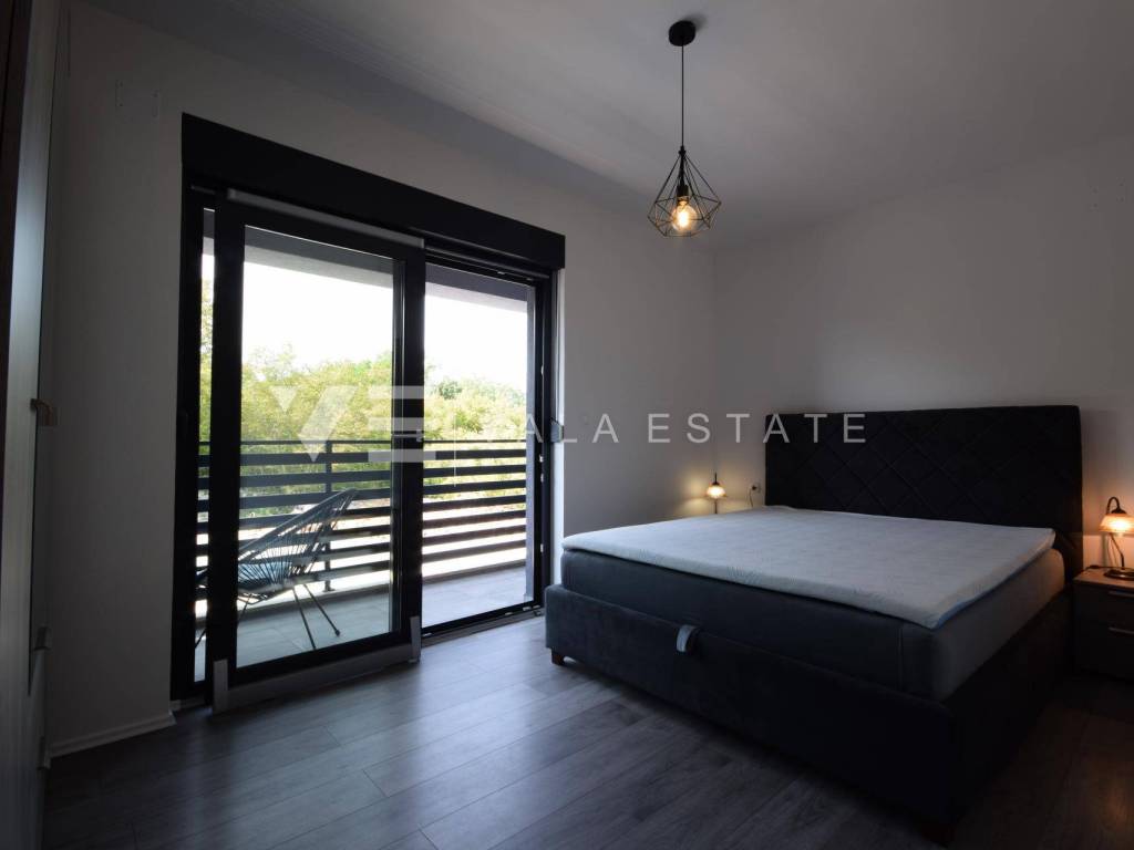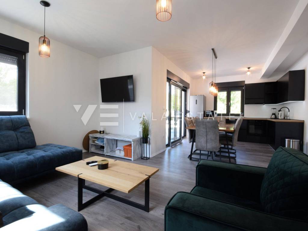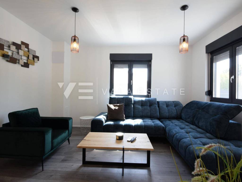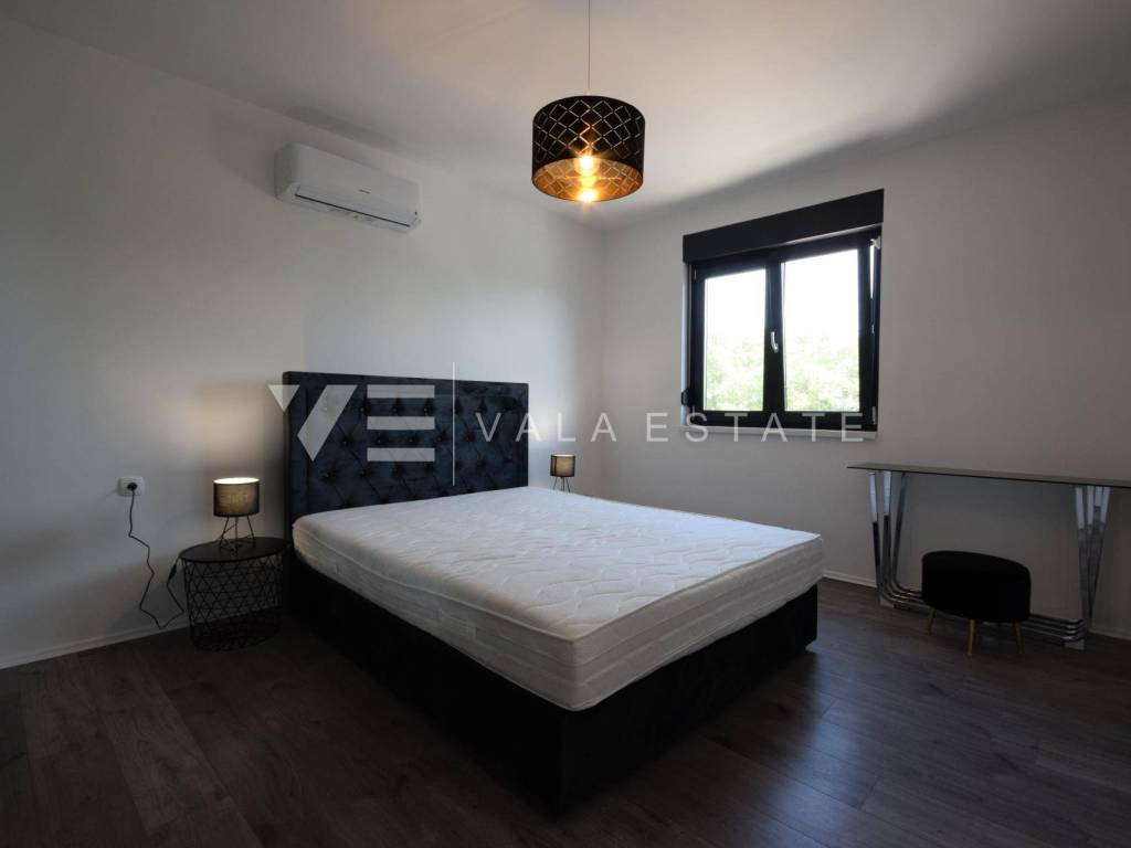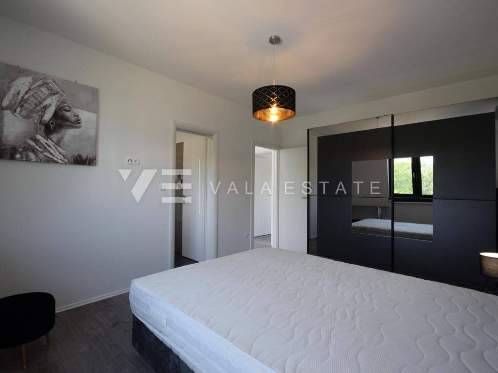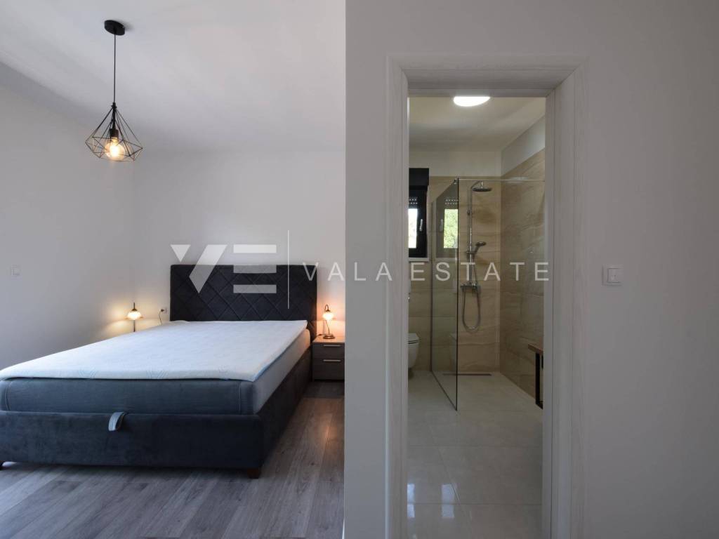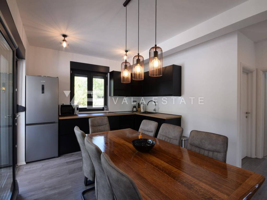 Real estate island of Krk, Dobrinj municipality - in a small quiet place of Dobrinj municipality, in a beautiful position surrounded by greenery, a new detached house of modern lines with a spacious garden and swimming pool for sale. The house occupies an area of 156 m2 and extends to the ground floor and first floor. The ground floor consists of an entrance area, toilet and pantry, one bedroom and a comfortable space that combines a kitchen, dining room and living room with access to a covered terrace and garden, while upstairs there are three more bedrooms, each with its own en suite bathroom and a balcony. The house is tastefully furnished with new modern furniture and completely ready to move in and use. It is built of high quality materials, paved with modern floor coverings of a combination of ceramics and stone, has modern sanitary ware and air conditioning, and a garden of 580 m2 is decently decorated with Mediterranean plants and pebbles and is complemented by a swimming pool with sundeck, lounge and summer kitchen. The location is extremely quiet surrounded by forest and greenery, 4000 m from the sea and beaches. An excellent opportunity for investment for the purposes of tourist rental, but also for your own enjoyment and vacation.