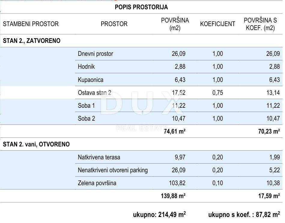 ISLAND OF CRES, CRES - Two-bedroom apartment on the ground floor, 2 parking spaces, 100m2 garden OPPORTUNITY ON CRES!! A modern new building with only 3 residential units is under construction. It is located on the edge of the green belt and offers a beautiful panoramic view of the sea and the Cres Bay. The new building will have garage spaces, which is a rarity in the area! The house extends over three floors: a basement with storage rooms, a ground floor consisting of two smaller apartments and a floor where a penthouse with panoramic views is located. Apartment 2 is located on the ground floor, has its own entrance and a living area of 57.09 m2, and consists of a hallway, two spacious bedrooms, a bathroom and an open space living area with a kitchen, dining room and living room. The living area leads to a covered terrace and a private garden of 103.82 m2. The apartment has 2 parking spaces, and in the basement there is a large storage room of 17.52 m2. The planned completion of the works is in the spring of 2026. Be ready to welcome the summer in a modern new building in the town of Cres itself! *** Dear clients, the agency commission is charged in accordance with the General Terms and Conditions: www.dux-nekretnine.hr/opci-uvjeti-poslovanja ID CODE: 37082 Iva Mršić Agent s licencom Mob: +385 91 575 9388 Tel: +385 91 480 8808 E-mail: iva@dux-nekretnine.hr www.dux-krk.com