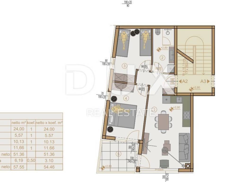 ISTRIA, PULA - Modern new building! Close to the city! LOCATION DESCRIPTION: Not far from the city center, only 1.5km, is this building plot where these 4 new residential buildings will be located. A few minutes away from the city center, close to the Pula bypass, shopping center, supermarket.. all these are items that describe a location that is truly excellent for a new start in family life or a location for a good investment. PROPERTY DESCRIPTION: The apartment in question is located on the first floor of a small residential building with only 4 residential units. It consists of an entrance hall, living room with kitchen and dining room, two bedrooms and a bathroom. The apartment is spacious and gets plenty of daylight through the glass walls in the living room. TECHNICAL DESCRIPTION - Bathrooms equipped with electric underfloor heating - Inverter air conditioners - High-quality aluminum joinery in anthracite gray - 10cm facade insulation - High-quality ceramics - Estimated start date of works: May 2025 - Estimated completion date of works: May 2026 Each new owner has the right to choose their own parking space. Smaller apartments have one parking space, while larger apartments have two parking spaces: - uncovered parking space: €7,500 - covered parking space: €18,750 For all questions, additional information and to arrange a viewing date for the property, please contact your agent. Dear clients, the agency fee is charged in accordance with the General Terms and Conditions: www.dux-nekretnine.hr/opci-uvjeti-poslovanja ID CODE: 37515 Aldin Begić Agent pripravnik Mob: +385 95 391 9185 Tel: +385 99 640 8438 E-mail: aldin@dux-istra.com www.dux-istra.com Deniro Osmanović Agent pripravnik Mob: +385 99 371 3802 Tel: +385 99 640 8438 E-mail: deniro@dux-istra.com www.dux-istra.com
