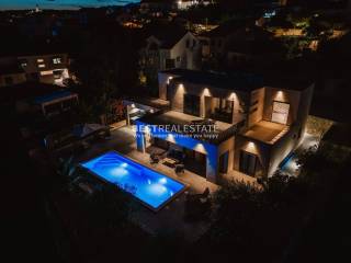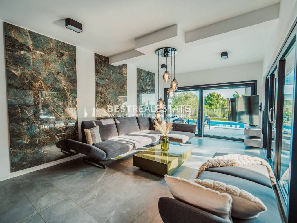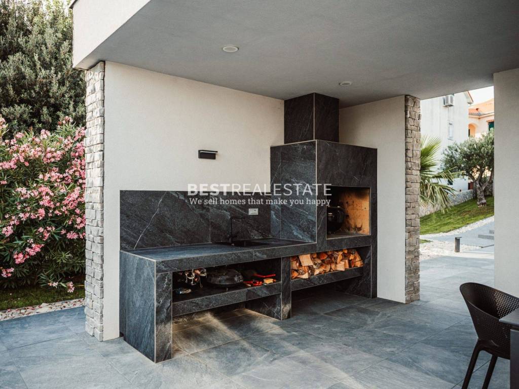 Unutrašnjost vile uređena je u modernom i luksuznom stilu, s puno prirodnog svjetla i pažljivo biranim detaljima. U vanjskom dijelu nalazi se privatni bazen, sunčalište, prostrana terasa s pogledom na more te vanjska kuhinja s roštiljem – savršeno za opuštanje i druženje na otvorenom.